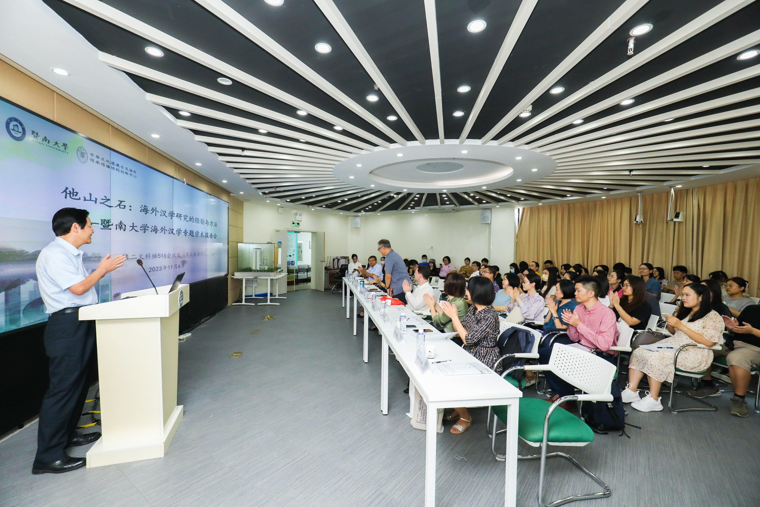 暨南大学融媒体中心讯 11月6日,暨南大学中华文化港澳台及海外传承传播协同创新中心(以下简称协同创新中心)在暨南大学石牌校区举办“他山之石:海外汉学研究的经验与方法”——暨南大学海外汉学专题学术报告会,邀请韩国翰林大学汉学家金敏镐教授、越南汉喃研究院青年汉学家阮苏兰研究员、复旦大学俄罗斯青年汉学家白若思研究员作报告。来自暨南大学、广东外语外贸大学、武汉大学、山西师范大学、佛山科技大学等多所高校近100名师生参会。