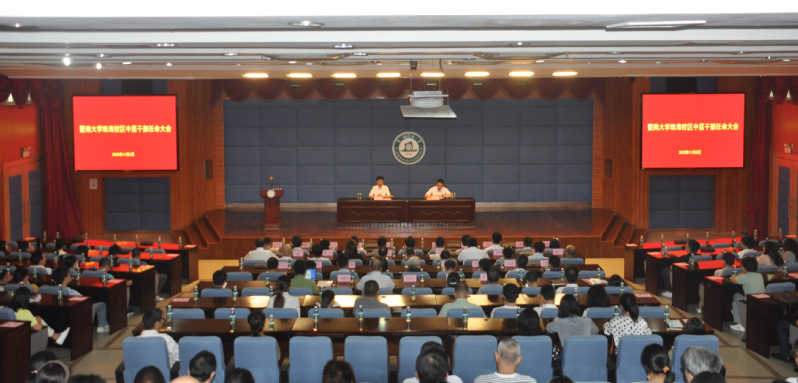 暨南大学融媒体中心 11月3日下午,珠海校区举行中层干部任命大会,学校副校长、珠海校区管委会主任张宏,党委组织部副部长陈龙,校区离任、调出、现任及新任中层干部及相关单位教职工参加了会议。会议由陈龙主持。