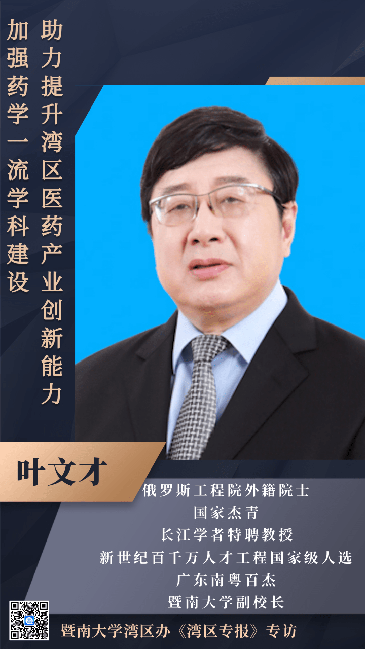 本期《湾区专报》“人物专访”栏目邀请到俄罗斯工程院外籍院士、国家杰青、长江学者特聘教授、新世纪百千万人才工程国家级人选、广东南粤百杰、暨南大学副校长叶文才教授,为我们介绍暨大“双一流”建设学科——药学学科在创新药物研发领域取得的建设成果及面临的机遇与挑战,以及他对粤港澳大湾区科技创新、科技人才队伍建设等方面的思考与建议。