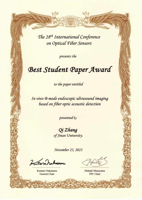 国际光纤传感大会是光纤传感领域最重要的国际性学术盛会,每18个月召开一次,在美洲、欧洲、亚太地区轮流举行。会议一直沿用单一会场制,口头报告数量极为有限,投稿隐去作者信息后提交技术程序委员评审打分,根据得分决定是否录用及报告类型。本届会议口头报告数量仅占全部投稿的11%,关柏鸥教授团队3篇投稿全部被录用为口头报告。马军副研究员做了题为“Miniaturized All-Fiber Photoacoustic Spectroscopy with High Spatiotemporal Resolution”的口头报告,博士生黄天晟做了题为“Measuring Kinetic and Efficiency Metrics of Capacitive Deionization by an Optical Fiber Sensor”的口头报告,博士生张琦做了题为“In vivo B-mode Endoscopic Ultrasound Imaging Based on Fiber Optic Acoustic Detection”的口头报告。张琦的口头报告荣获了最佳学生论文奖(Best Student Paper Award),是本次会议三个最佳学生论文奖之一。