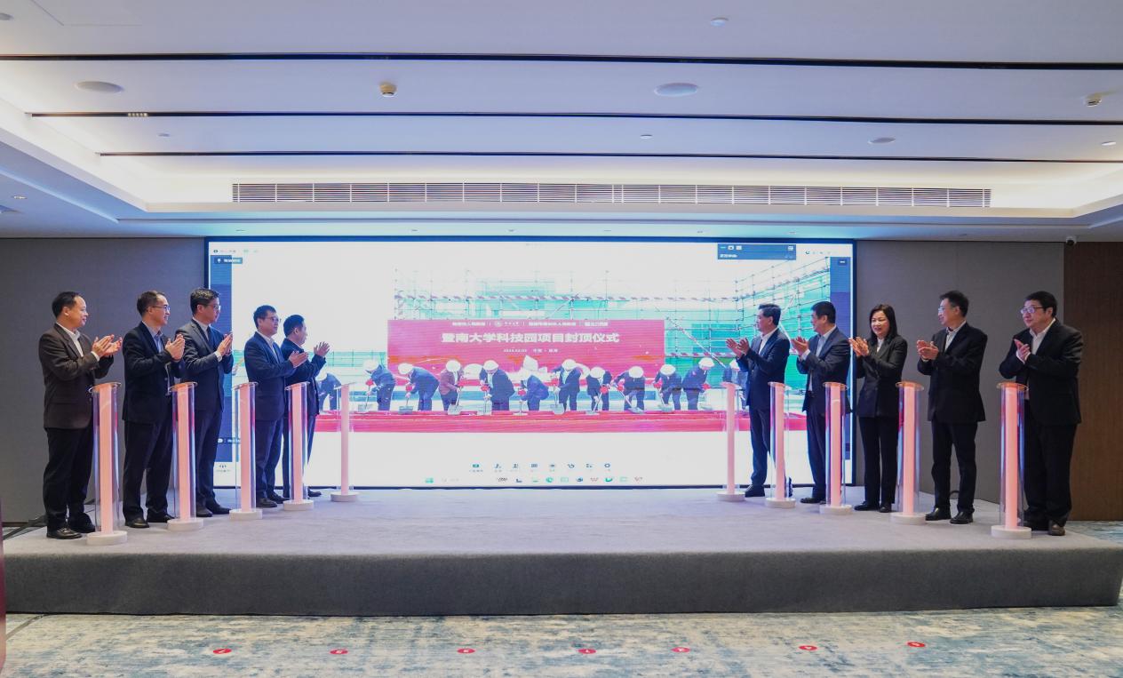 会场校地领导上台共同点亮灯柱,启动暨南大学科技园主楼封顶仪式。随着我校及正方集团代表在主楼楼顶完成最后一注混凝土浇筑,主楼封顶。科技园是2021年3月以来校地新一轮战略合作的标志性成果,投资约20亿元、总建筑面积约28万平方米,配套建设暨南大学珠海研究院,聚力打造“研发机构+众创空间+孵化器+加速器+产业园区”全链条科技创新创业孵化载体。园区建设三年多来,市、校、区高度重视,项目如期推进,将为校地携手立足珠海、服务湾区、链接全球,聚力打造“暨南硅谷”奠定坚实基础。