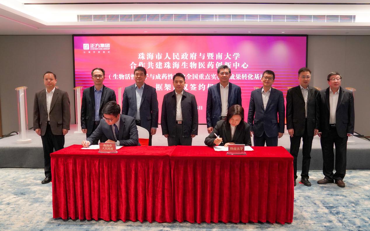 随后,李翀、洪岸代表市、校签订共建珠海生物医药创新中心(生物活性分子与成药性优化全国重点实验室成果转化基地)框架协议,黄志豪、林如鹏、邢锋、李伟辉、张宏,刘齐英、叶文才、林日团上台见证。根据协议,珠海生物医药创新中心拟落户香洲创港中心,将由珠海市政府、香洲区与暨南大学全国重点实验室合作,联动珠海P3实验室打造而成。创新中心依托暨南大学全国重点实验室优势资源,聚焦科研成果转化落地,推动生物医药研究成果工程化、产业化、市场化,助力珠海的产业转型升级和创新发展。