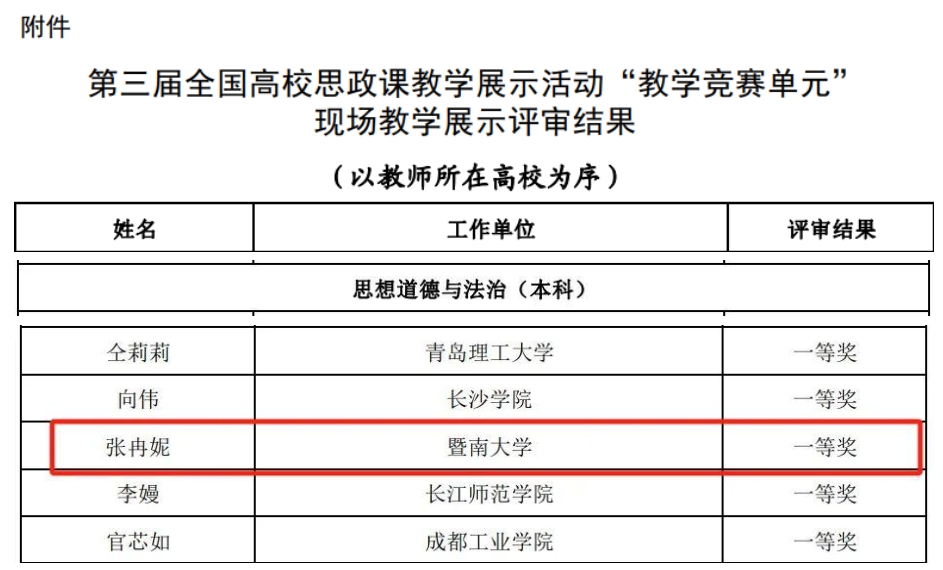 暨南大学融媒体中心讯 近日,教育部公示了第三届全国高校思想政治理论课教学展示活动“教学竞赛单元”评审结果。暨南大学马克思主义学院张冉妮老师作为广东省“思想道德与法治”课的唯一代表,荣获《思想道德与法治》课程本科组全国一等奖。
