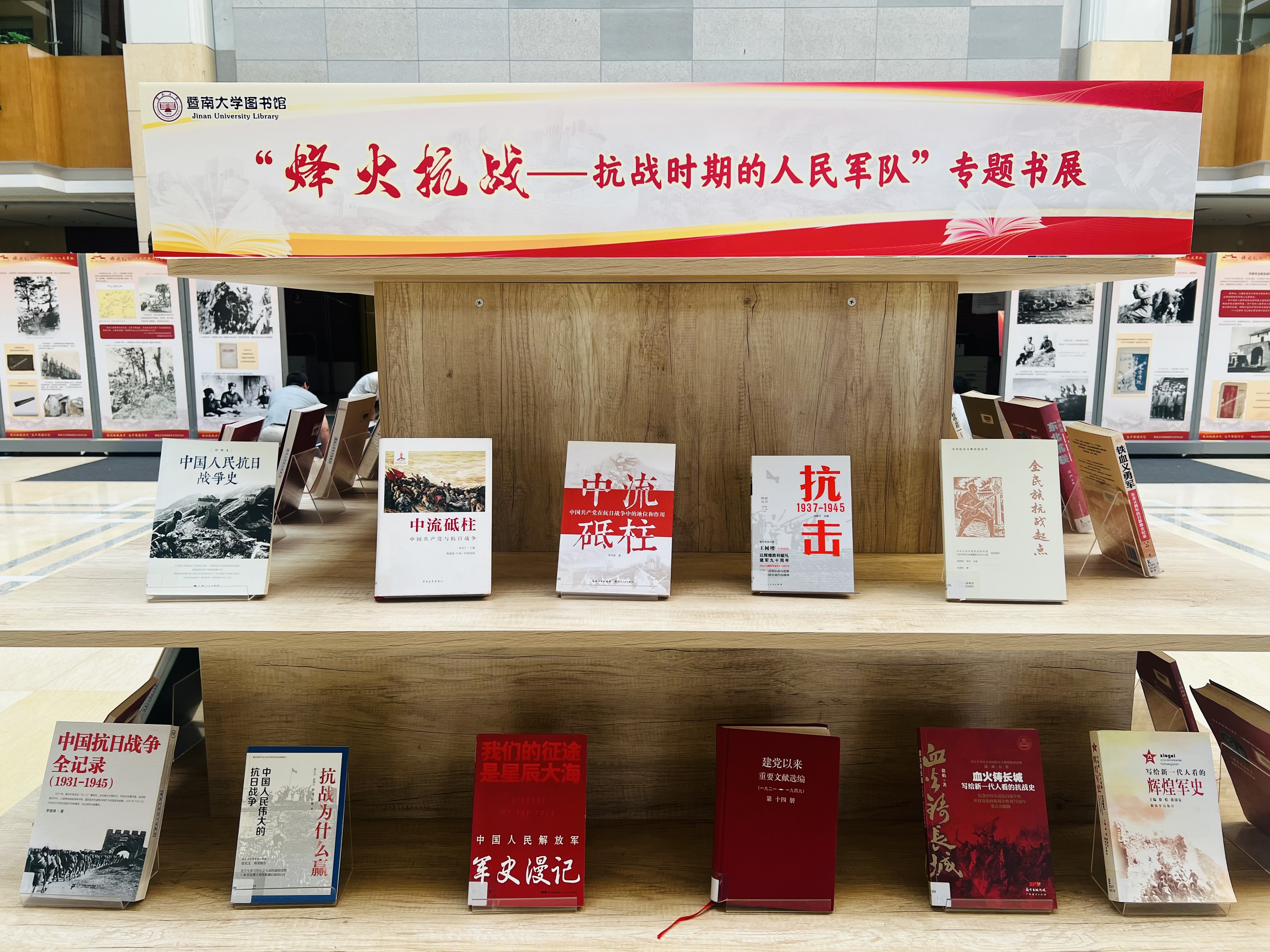 本次展览展出了抗战时期的500余张史料图片,生动呈现了中国共产党及其领导的东北抗日联军、八路军、新四军和华南人民抗日游击队等人民武装力量在敌后战场浴血奋战的壮烈场景。来自暨南大学专题展览志愿讲解队的学生讲解员为师生进行导览,深入解读抗日战争的历史故事。同时,暨南大学图书馆联合党委学生工作部同步举办“烽火抗战——抗战时期的人民军队”专题书展,精选馆藏图书百余册,以图书形式展现这段用热血和生命谱写出的峥嵘岁月,展于展厅中央书架。