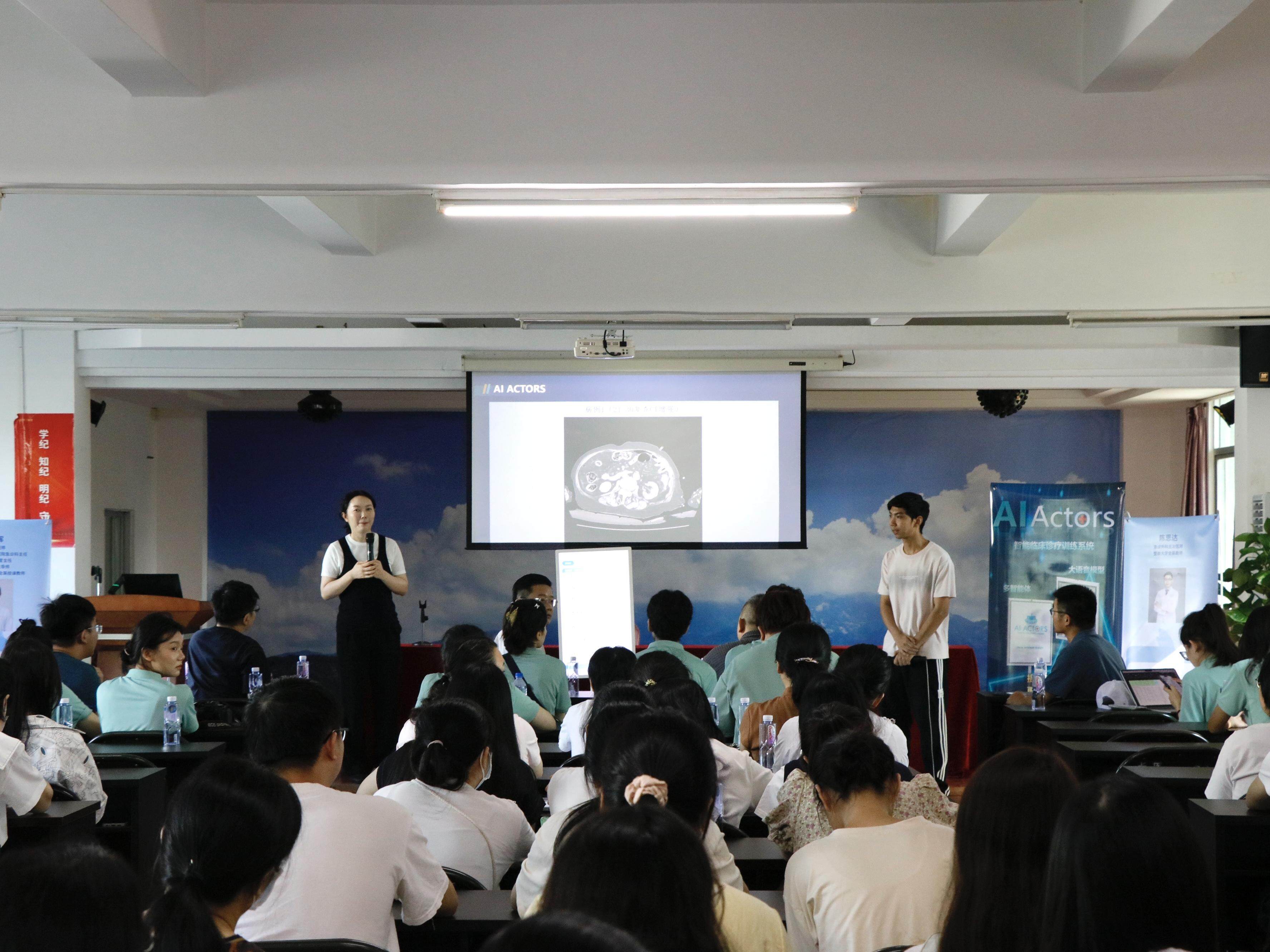 在博罗县长宁镇中心卫生院,团队带去了由成员牵头研发“AIActors”智能临床诊疗训练系统,该系统依托AI标准化病人和真实病例库构建虚拟训练环境,融合大语音模型与多智能体技术,为医学生或青年医生提供高效、高度仿真的问诊场景,有效解决了基层医务工作者培训不足,病例较少等难题。团队的临床医学专业留学生们也展示了该系统的多语种使用方法。