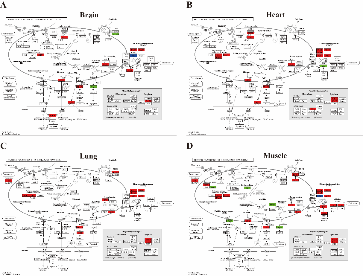 图2.内质网中的蛋白质加工通路在平胸龟脑(A)、心脏(B)、肺(C)和肌肉(D)中富集情况