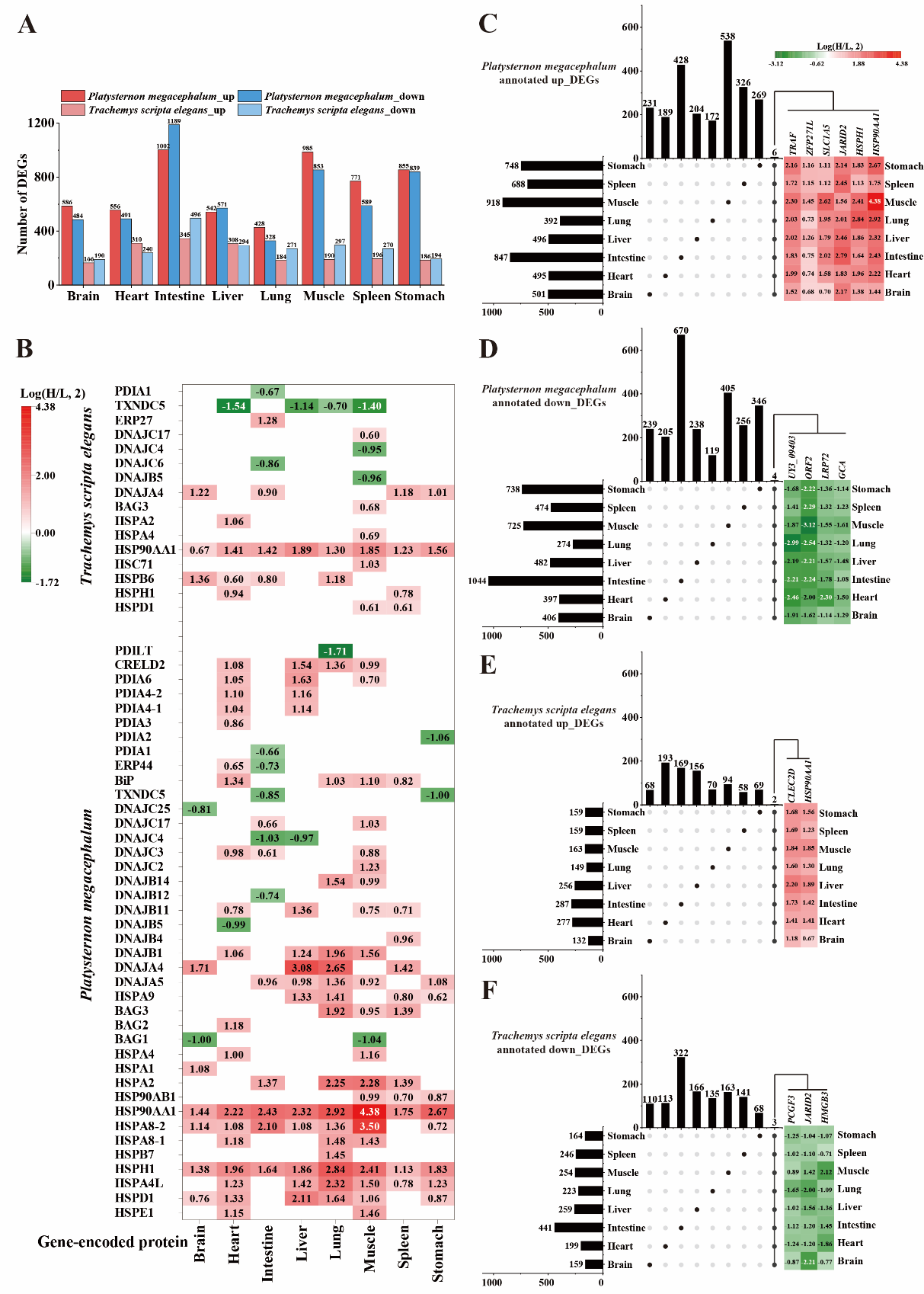 为此,暨南大学龚世平教授团队联合广东省科学院动物研究所科研人员,对32℃高温胁迫下平胸龟和红耳龟的8个主要器官进行了系统性的比较转录组学研究。该研究发现:平胸龟表现出强烈的“全器官应激反应”:能量与脂质代谢基因广泛下调,体现“代谢抑制”策略,但也导致细胞功能受限;多个器官中内质网应激通路被激活,分子伴侣(HSP40、HSP70、BiP)和凋亡相关基因(如CHOP)高表达;尤其值得注意的是,细胞增殖调控基因JARID2在所有器官中均上调,可能进一步抑制修复能力,加剧热损伤。相反,红耳龟响应非常“克制”:差异基因数量少,器官间变化差异小。其耐热策略体现为“开源节流”:大脑中核糖体基因上调,增强蛋白质修复能力;肠道则下调细胞周期基因,将能量集中于应激响应;JARID2普遍下调,可能释放细胞增殖潜能,促进组织修复(图1)。