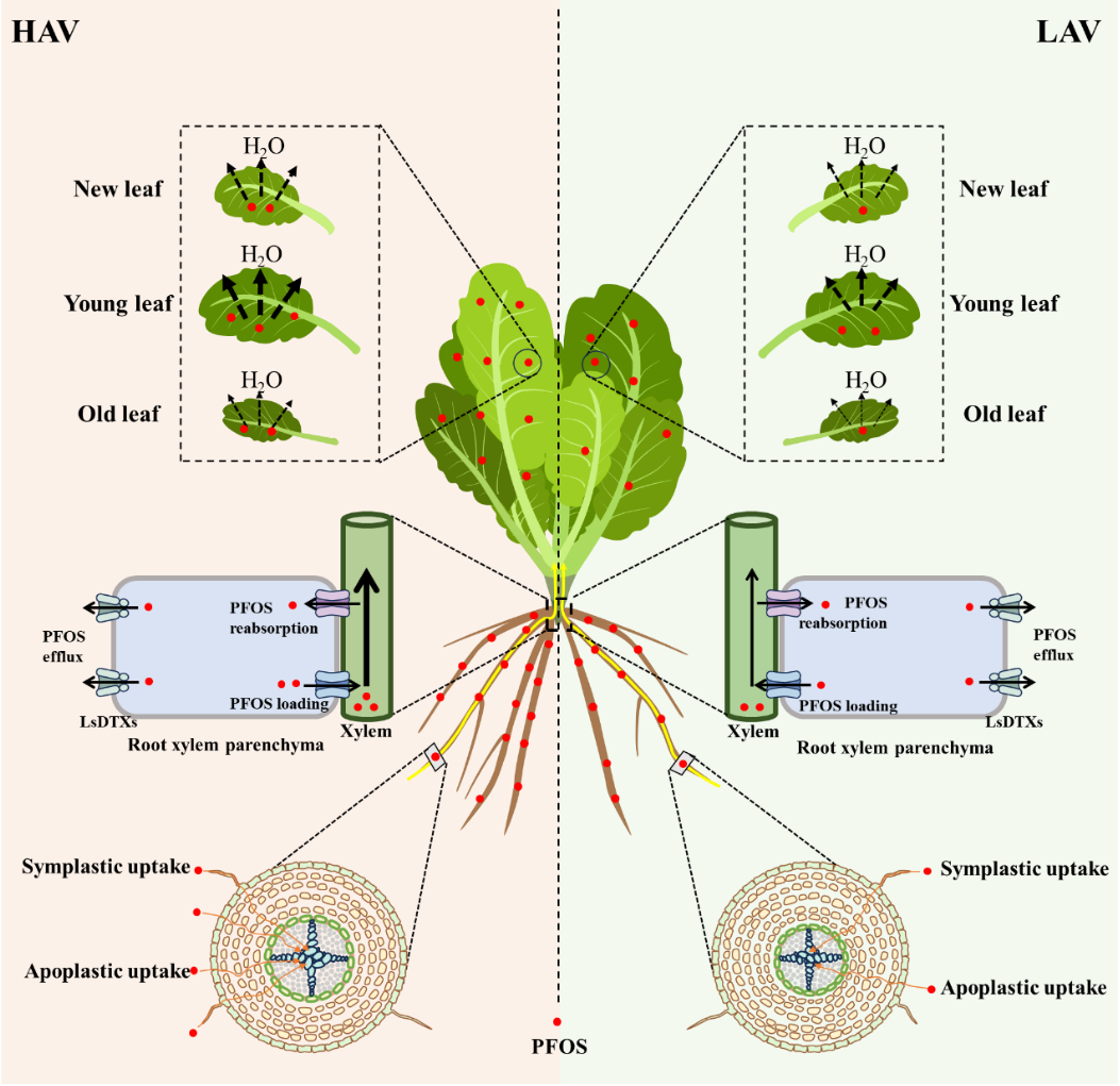 图 5.生菜高积累品种(HAV)、低积累品种(LAV)吸收、转运、分布PFOS的模型图。红色圆点代表 PFOS。