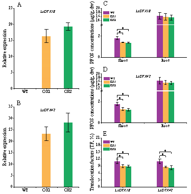 图3.过表达LsDTX18和LsDTX42对拟南芥吸收积累PFOS的影响。OX1和OX2分别为LsDTX18和LsDTX42的拟南芥转基因株系,WT为拟南芥野生型株系。TF为PFOS转运系数。