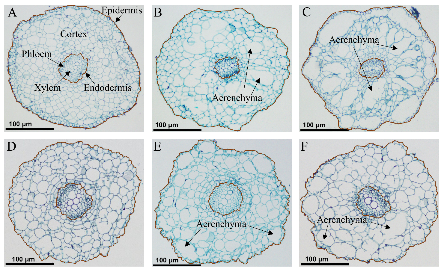 图1.生菜低积累品种(LAV)和高积累品种(HAV)的根解剖学特征:A、B 和 C分别代表对照、0.2和 1.0 mg/L PFOS暴露条件下LAV 的根结构;D、E 和 F 分别为对应浓度PFOS暴露条件下HAV 的根结构。