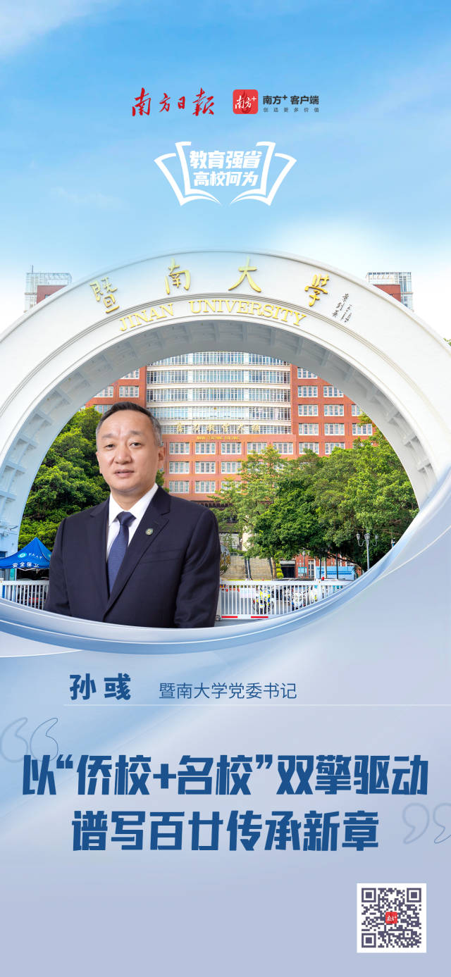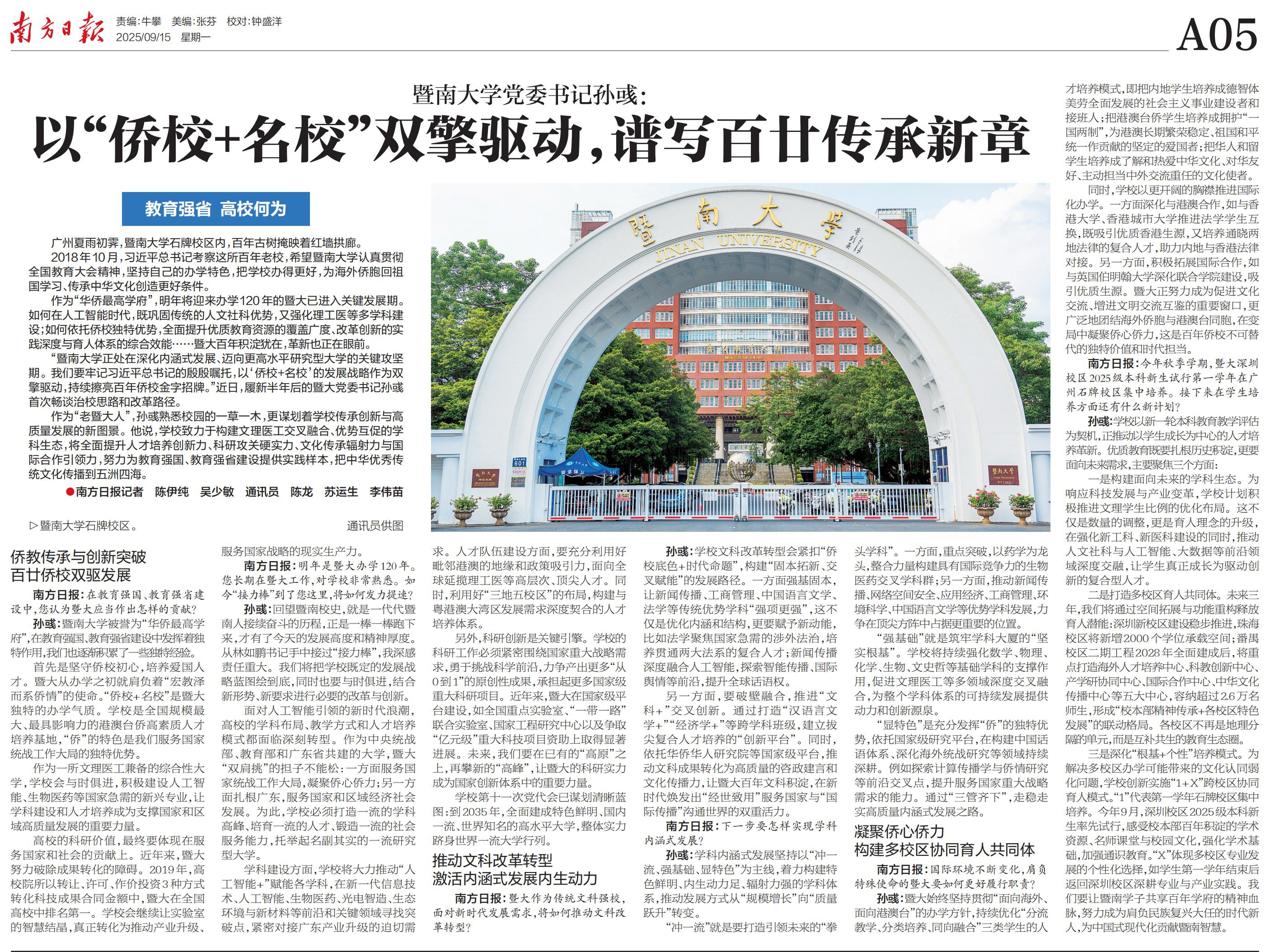 暨南大学融媒体中心讯 9月15日,南方日报、南方+“教育强省 高校何为”专栏推出暨南大学党委书记孙彧专访《暨南大学党委书记孙彧:以“侨校+名校”双擎驱动,谱写百廿传承新章》。报道中,孙彧书记深入讲述学校在服务教育强国、教育强省建设发挥的独特作用和经验,并展望建校120周年,畅谈百廿侨校发力提速、创新突破、双驱发展,持续擦亮金字招牌的治理思路和改革路径。现将报道全文转载如下: