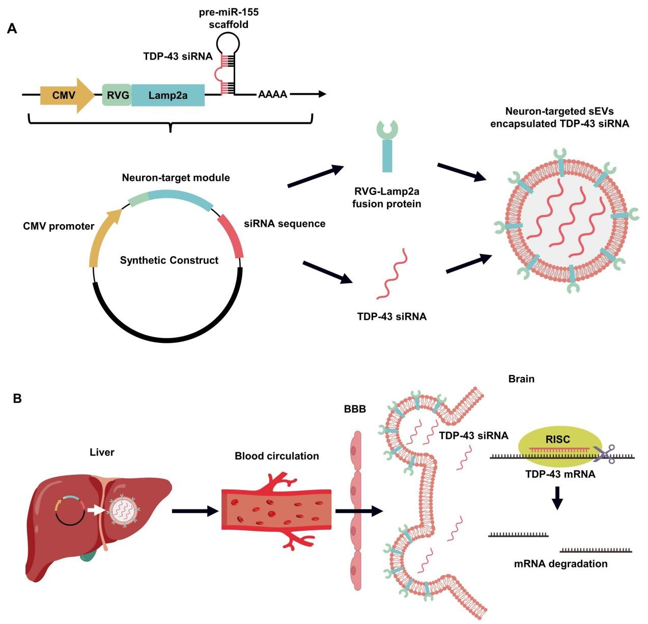 内源性细胞能选择性地将miRNA包装到小细胞外囊泡中,后者可携带miRNA递送至受体细胞,抑制靶基因表达。小细胞外囊泡具有低免疫原性、良好生物相容性,能在体内保护和运输小RNA,还有工程化穿越血脑屏障的潜力。基于此,研究团队基于合成生物学原理,创新设计了一个靶向TDP-43的体内自组装siRNAs合成构建体(质粒DNA形式),包含CMV高效启动子、TDP-43 siRNAs表达骨架以及靶向神经元的RVG-Lamp2a融合蛋白标签。体内自组装siRNAs静脉注射后被肝脏摄取,肝脏细胞表达各功能模块,合成pre-miRNA经内源性加工形成成熟TDP-43 siRNAs,并自发组装到RVG肽修饰的小细胞外囊泡中。这些小细胞外囊泡携带TDP-43 siRNAs进入血液循环,在RVG靶向标签作用下高效穿越血脑屏障,递送至神经中枢系统,靶向TDP-43 mRNA,降低其表达水平。