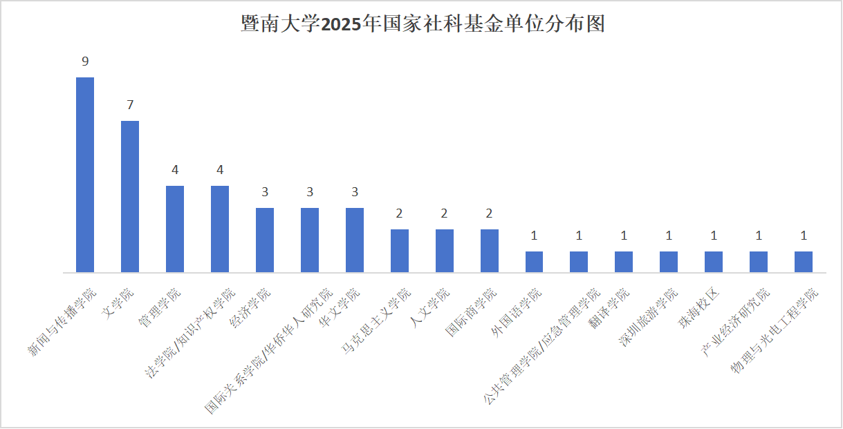 暨南大学融媒体中心讯 9月29日,全国哲学社会科学工作办公室公布2025年国家社会科学基金年度项目立项名单,暨南大学获批46项,项目获批量创历史新高,立项数位列全国第13位,较去年提高了5位,居“双一流”建设高校前列。