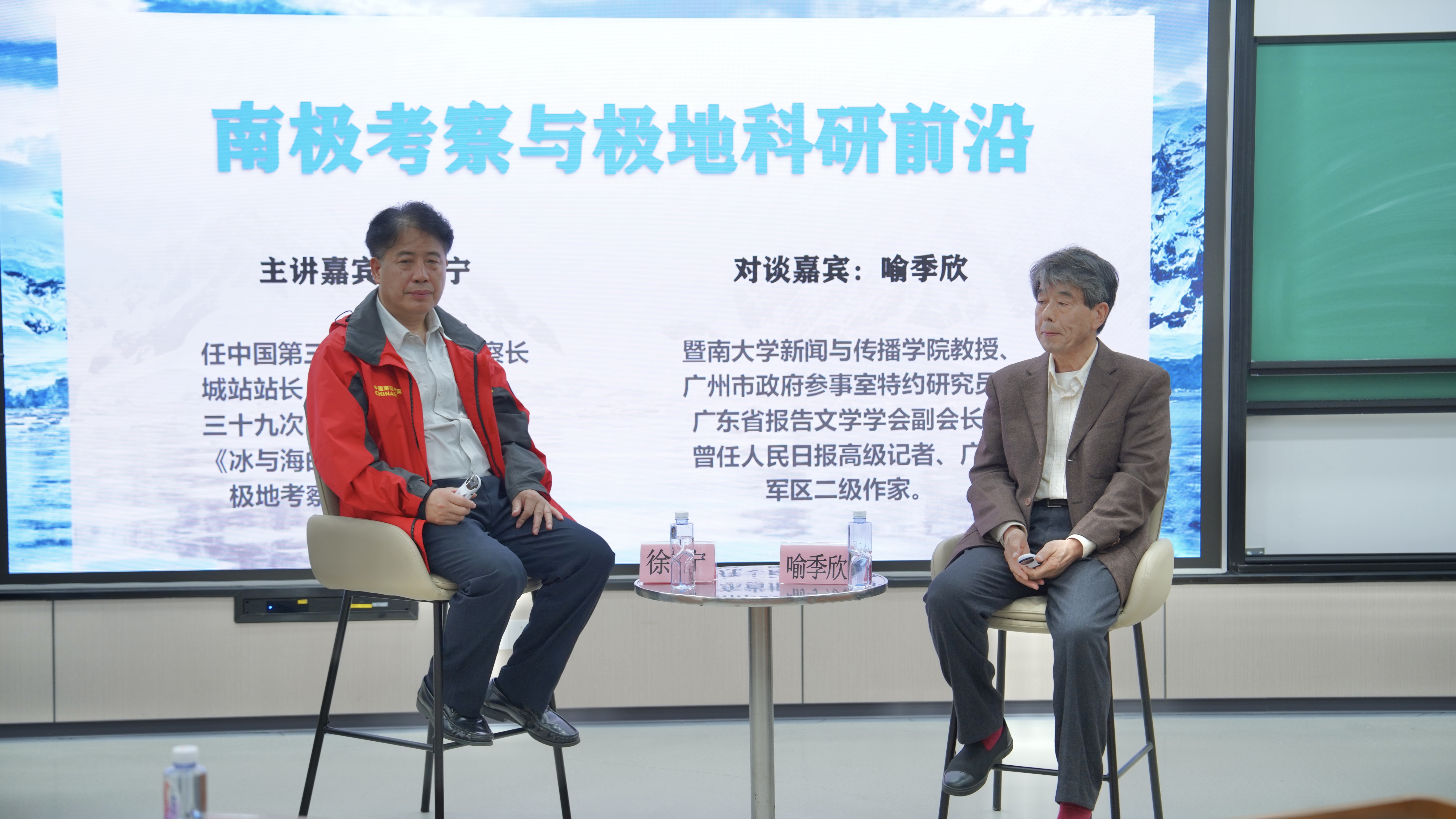 暨南大学融媒体中心讯 12月16日,由暨南大学党委宣传部主办的“百年暨南文化素质教育讲堂”第364期在石牌校区管理学院315报告厅举行。本次讲堂以“勇毅前行 筑梦极地——中国极地考察40周年”为主题,特邀中国第三十一次南极考察长城站站长徐宁担任主讲嘉宾,暨南大学教授、广州市政府参事室特约研究员喻季欣作为对谈嘉宾出席。讲座由暨南大学物理与光电工程学院教授徐繁荣主持。