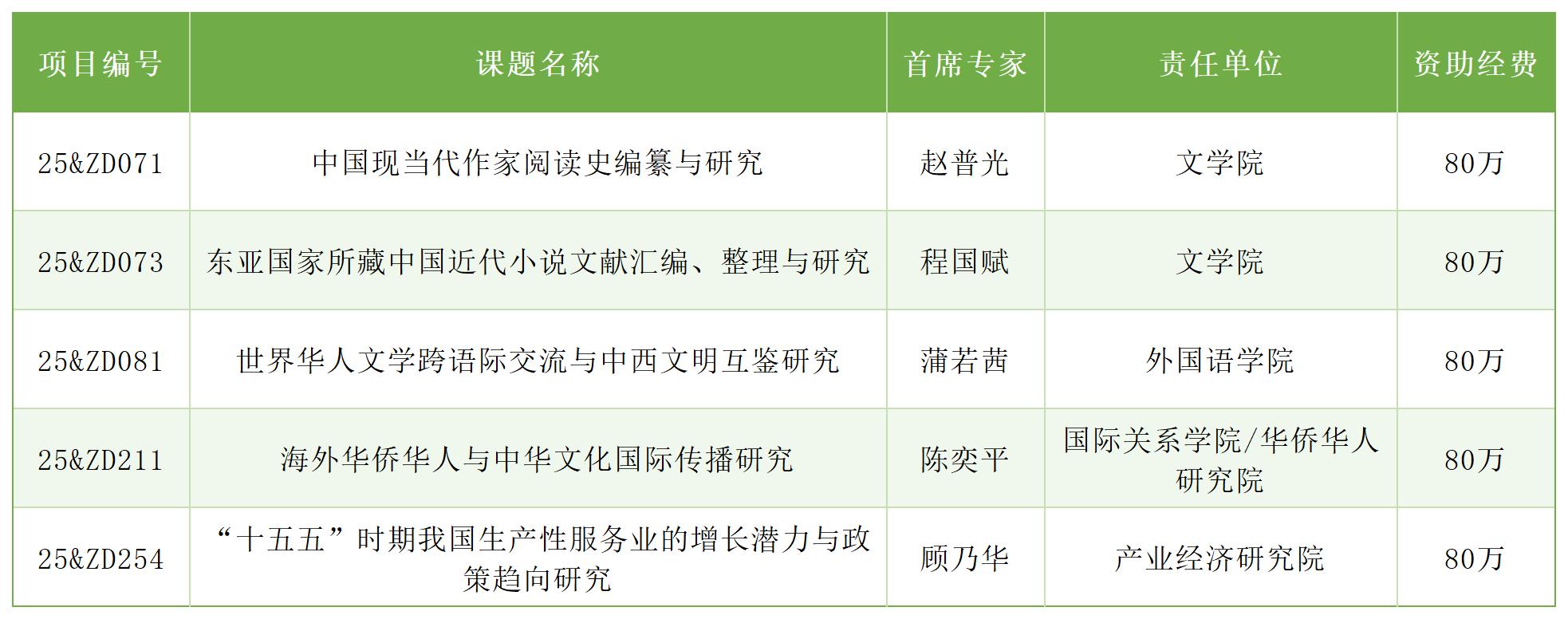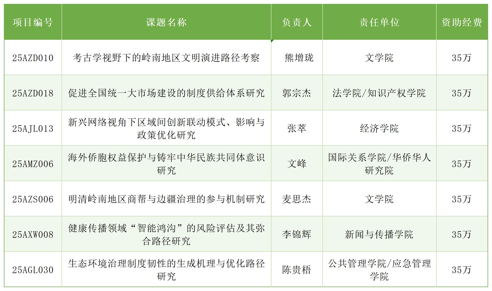 暨南大学融媒体中心讯 12月19日,2025年国家社科基金年度重大项目立项名单公布,全国共计资助300项,由137家单位承担。其中,暨南大学获批5项,立项数居全国第12位,广东省第1位,在“双一流”建设高校中成绩亮眼,表现突出。