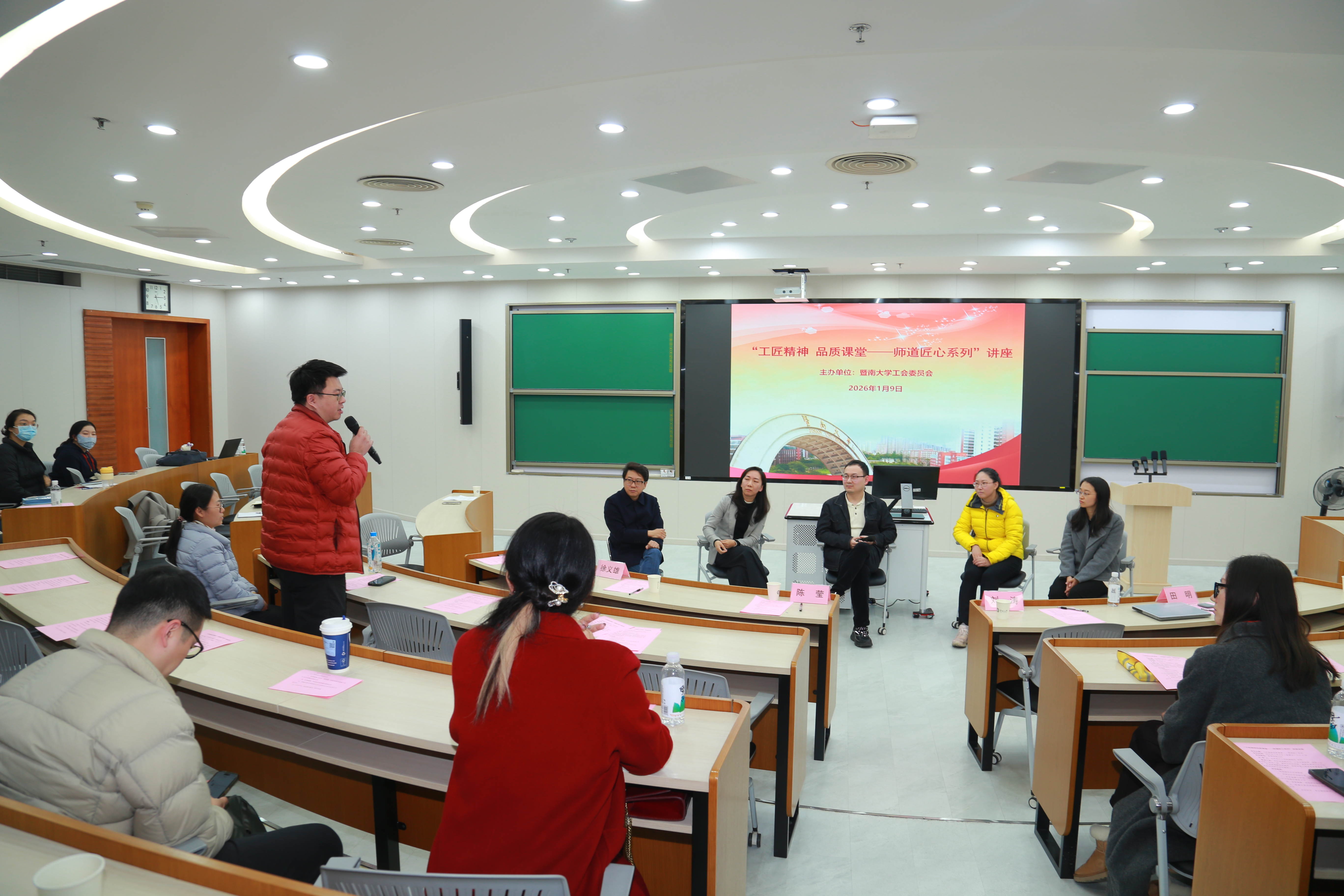 暨南大学融媒体中心讯 1月9日下午,由学校工会主办的“工匠精神品质课堂——师道匠心系列”分享会在管理学院219课室举办。分享会通过示范观摩、经验分享、专家引领等多种形式开展交流。学校党委副书记、工会主席陈莹出席并致辞,学校工会、教务处、教师发展中心负责人,青教赛获奖教师代表与全校数十名青年教师参加了分享会。分享会由全国青教赛一等奖获得者、马克思主义学院副院长田明主持。