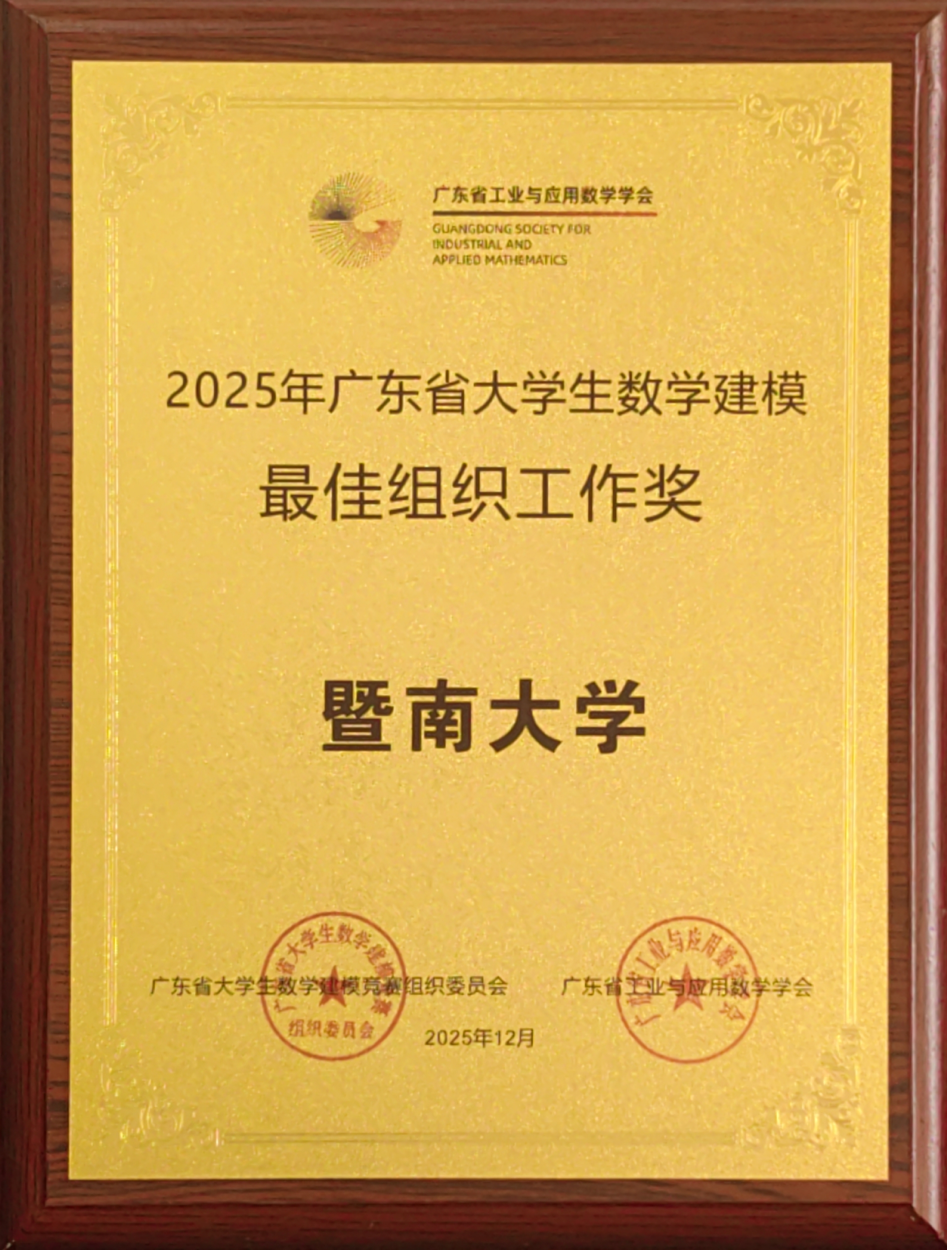 暨南大学荣获“2025年广东省大学生数学建模最佳组织工作奖”