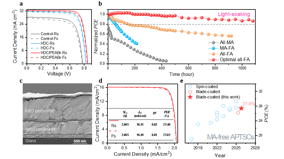 在此基础上,团队通过在钙钛矿前驱体中添加少量二氯化肼(HDC),使用刮涂工艺制备了高质量的甲脒基Pb-Sn钙钛矿薄膜。研究表明,HDC与Sn2+离子的选择性强配位作用不仅抑制了Sn2+的氧化,更重要的是,平衡了Sn基和Pb基物相的成核速率,从而显著提高了钙钛矿薄膜中Pb-Sn合金相的均匀性。所制备的单结全甲脒基Pb-Sn钙钛矿太阳能电池和无MA叠层器件分别实现了21.81%和27.40%的光电转换效率。此外,未封装的全甲脒基Pb-Sn器件在85℃下经受190小时的热应力后,仍能保持初始效率的80%以上。该研究得到国家自然科学基金(62174069,U21A20102,M-0515,62374053)等项目的资助。