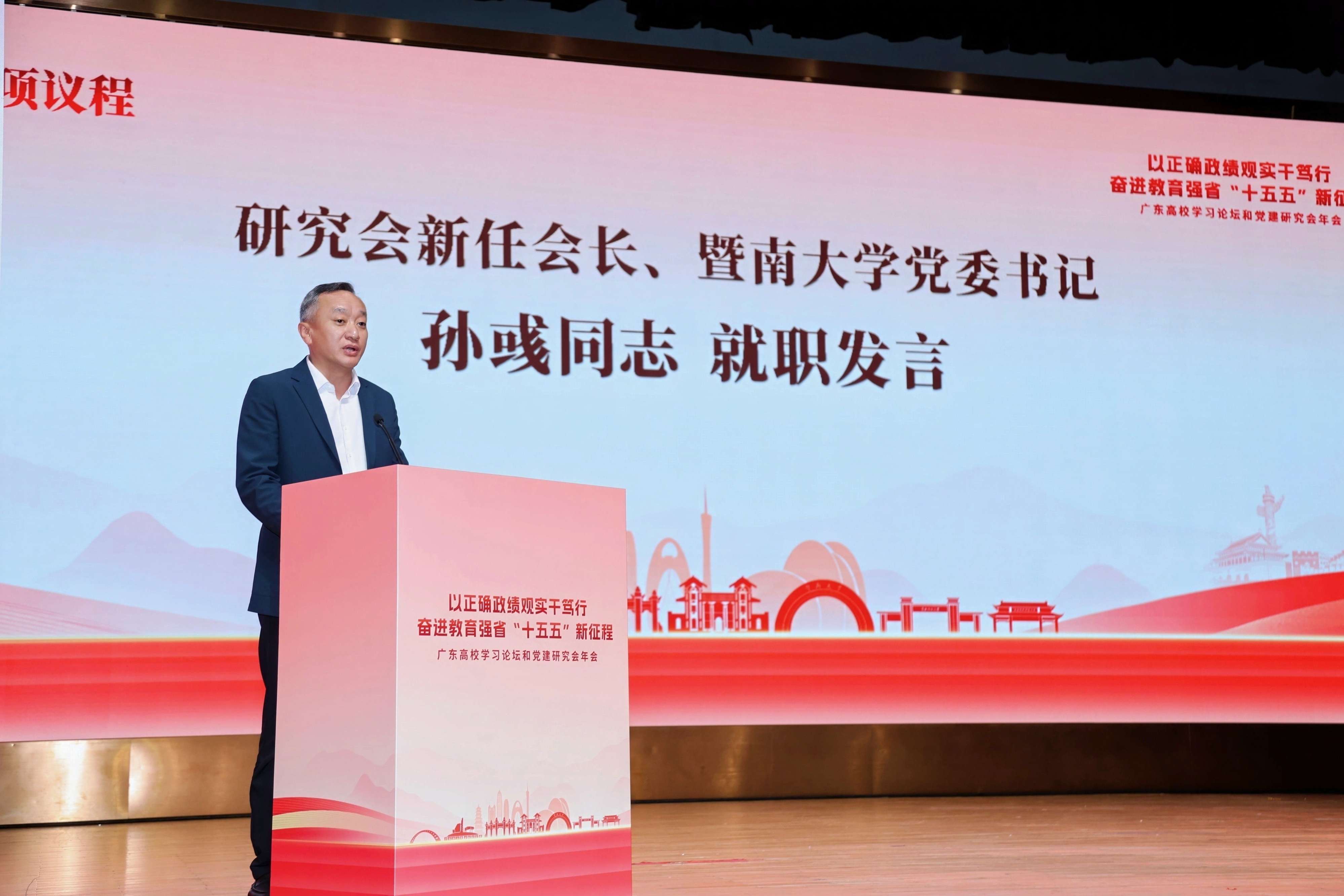 研究会新任会长、暨南大学党委书记孙彧作就职发言。他表示,在省委教育工委、省教育厅的坚强领导下,在各会员高校的同心协力下,研究会将聚焦“三个着力”:以政治建设为统领,筑牢高站位、强引领的理论阵地;以服务实践为导向,打造接地气、有实效的党建智库;以自身建设为支撑,建设有活力、有温度的“会员之家”,持续推进“一刊一号一论坛”矩阵工程,努力把研究会建设成为政治坚定、学术繁荣、服务有力、团结奋进的高校党建研究高地,为广东教育强省建设、高等教育高质量发展提供坚强政治保证和智力支撑。