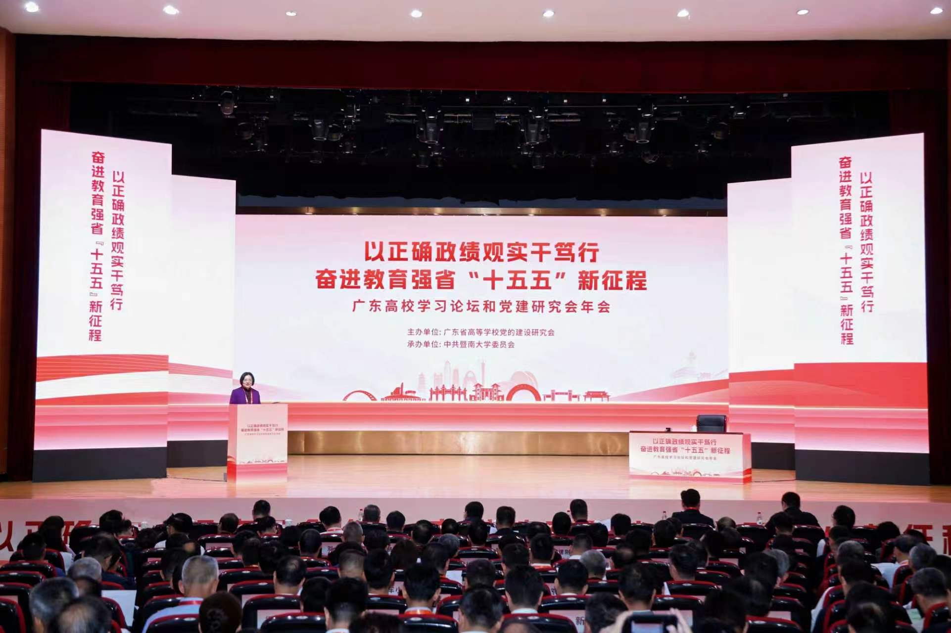 暨南大学融媒体中心讯 3月21日,由广东省高等学校党的建设研究会主办、暨南大学党委承办的广东高校学习论坛和广东高校党的建设研究会年会在广州召开。本次大会“以正确政绩观实干笃行,奋进教育强省‘十五五’新征程”为主题,深入学习贯彻2026年全国两会精神,全面落实省委“走在前、作示范、挑大梁”部署要求,聚焦树立和践行正确政绩观,共谋高校党建高质量发展大计。