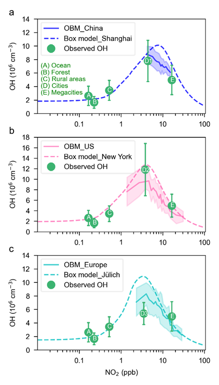研究团队开发了一种基于观测的模型,定量解析了中国、欧洲和美国地表大气OH浓度的时空演变特征,并识别出其关键转折点。结果表明,相较于清洁区域,中国、美国和欧洲的OH浓度提升了约300%,主要受人为NOx排放驱动,清晰揭示了人为活动对大气氧化能力的显著增强。