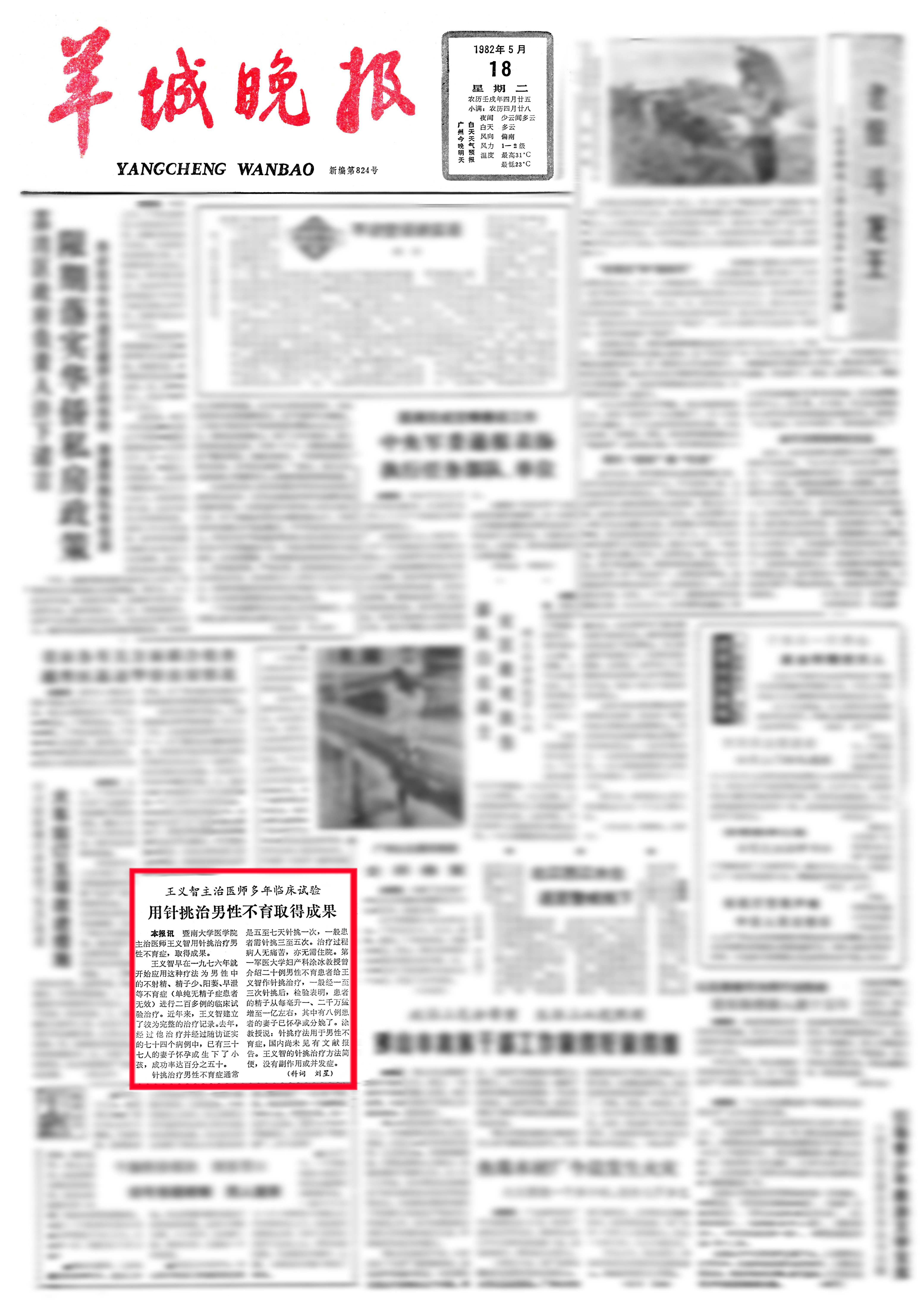 1982年5月18日羊城晚报头版介绍王义智主治医师用针挑治疗男性不育症取得成果的报道