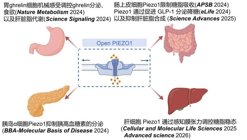 这一系列研究系统揭示了Piezo1机械敏感通道在胃、肠道、肝脏等消化器官中对糖脂代谢的多层次调控作用,构建起“机械感知-代谢调控”的新理论框架。研究成果不仅为理解人体能量代谢稳态维持机制提供了全新视角,更为肥胖、糖尿病、脂肪肝等代谢性疾病的防治提供了潜在的新靶点和新策略。