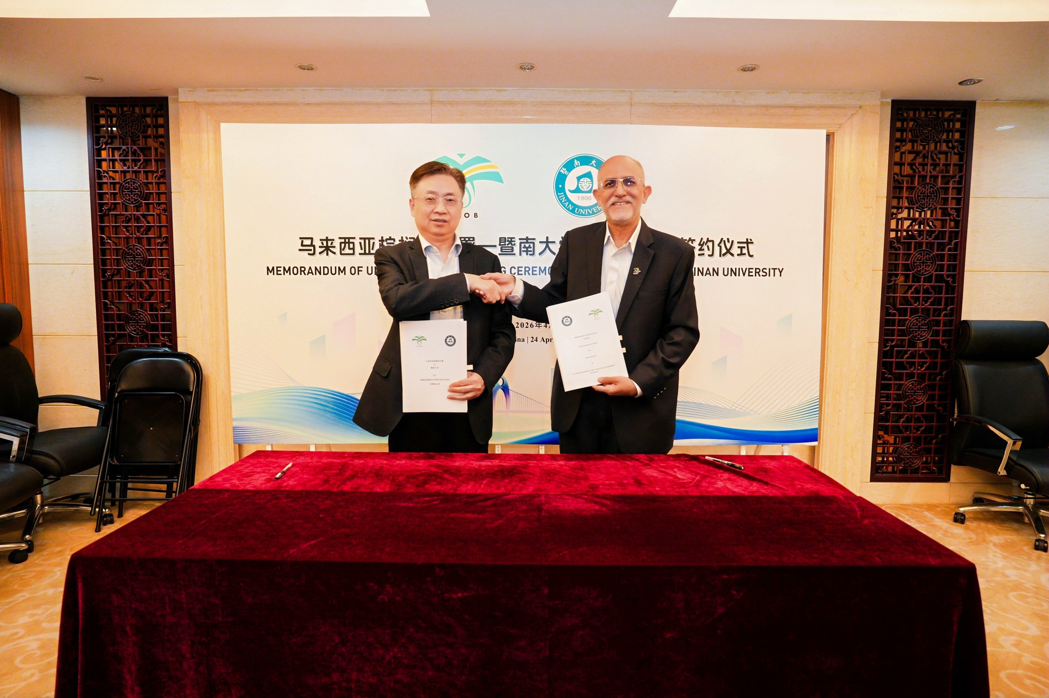 座谈结束后,双方签署并交换《暨南大学与马来西亚棕榈油总署关于棕榈油领域的合作研究和技术推进的谅解备忘录合作谅解备忘录(MOU)》,为进一步推动双方合作以及中马“一带一路”联合实验室建设奠定基础。