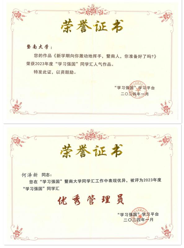 近日,“学习强国”学习平台同学汇年度奖项颁布,暨南大学作品《新学期向您激动地挥手,暨南人,你准备好了吗?》荣获2023年度“学习强国”同学汇人气作品;暨南大学党委宣传部何泽新荣获2023年度“学习强国”同学汇优秀管理员荣誉称号。