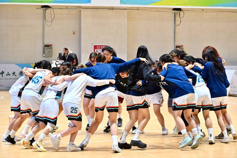 5月13日,暨南大学女子篮球队在摘得甲组桂冠后,激动地相拥庆祝。(摄影/赖桂筠)