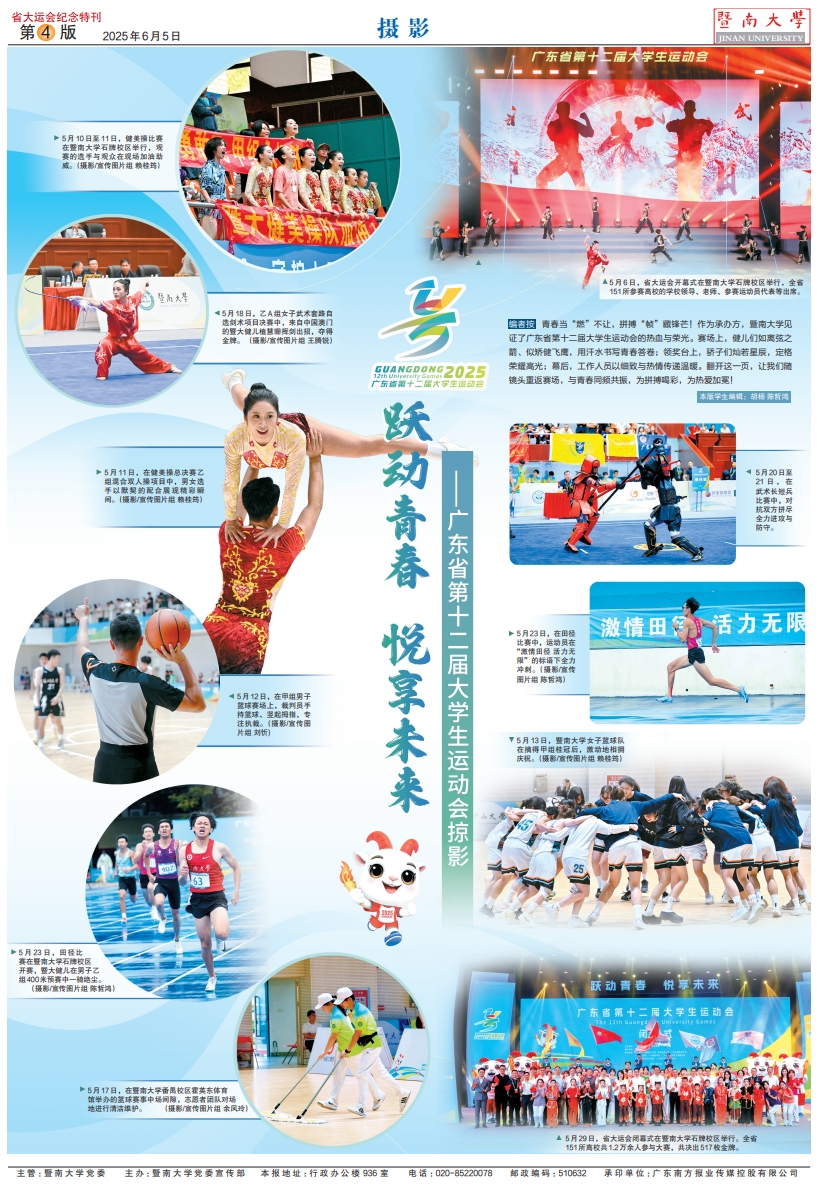 【编者按】青春当“燃”不让,拼搏“帧”藏锋芒!作为承办方,暨南大学见证了广东省第十二届大学生运动会的热血与荣光。赛场上,健儿们如离弦之箭、似矫健飞鹰,用汗水书写青春答卷;领奖台上,骄子们灿若星辰,定格荣耀高光;幕后,工作人员以细致与热情传递温暖。翻开这一页,让我们随镜头重返赛场,与青春同频共振,为拼搏喝彩,为热爱加冕!
