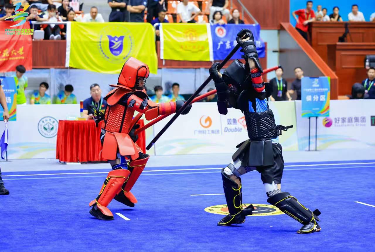 5月20日至21日,在武术长短兵比赛中,对抗双方拼尽全力进攻与防守。