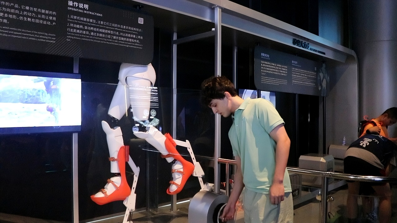团队还前往深圳科技馆参观学习。伊朗留学生Peransa Hamidi通过人体经络感应装置,直观体验传统中医智慧与现代数字可视化技术的惊艳融合;阿塞拜疆学生Azer Mahmudov穿戴智能仿生靴,亲身感受中国在助残科技领域的成就与人文关怀。这场沉浸式科技之旅成为中外青年理解中国创新活力的共同语言。
