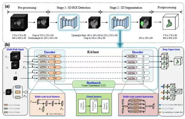 研究团队针对右心房分割面临的类别不平衡、解剖结构变异大等挑战,设计了融合卷积神经网络(CNN)与视觉 Transformer 的混合架构 RASnet。该框架通过多路径输入模块捕捉多尺度特征,多尺度特征融合模块增强局部与空间信息保留,视觉 Transformer 模块捕捉全局上下文,多尺度上下文交互模块优化边缘分割,并结合深度监督机制提升模型鲁棒性。团队在包含 354例 LGE-MRI 的数据集(RAS 数据集 154例、JNU 独立数据集 200例)上开展实验。结果显示,RASnet 在主要数据集上的 Dice 系数达 92.19%,Jaccard 系数 0.8563,Hausdorff 距离 13.19,显著优于现有主流模型(如 nnUnet、MedSAM 等);在独立验证集上仍保持领先性能,证明其强大的泛化能力。