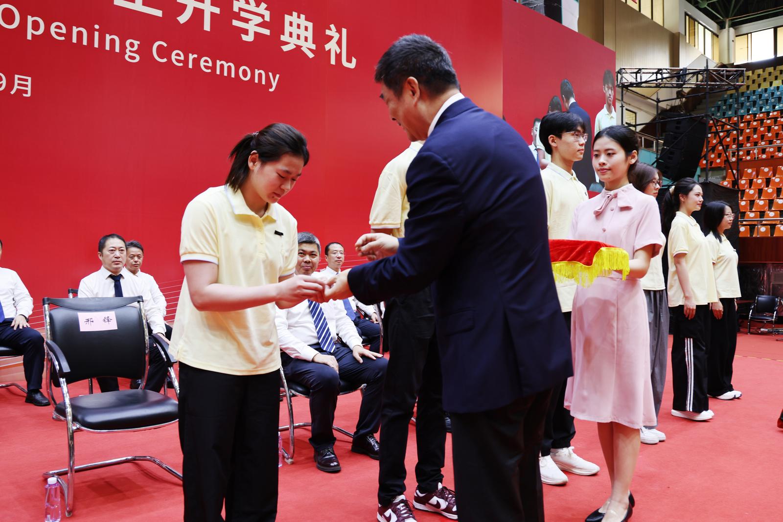 在新生训练营(以下简称“新训”)开营仪式上,孙彧、邢锋、张宏等为新生代表颁授新训营旗,校党委副书记、纪委书记夏泉,副校长洪岸、翁健、顾乃华为新训学生工作团队教导员和跑团领跑员颁发聘书。