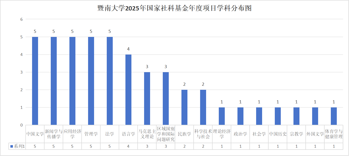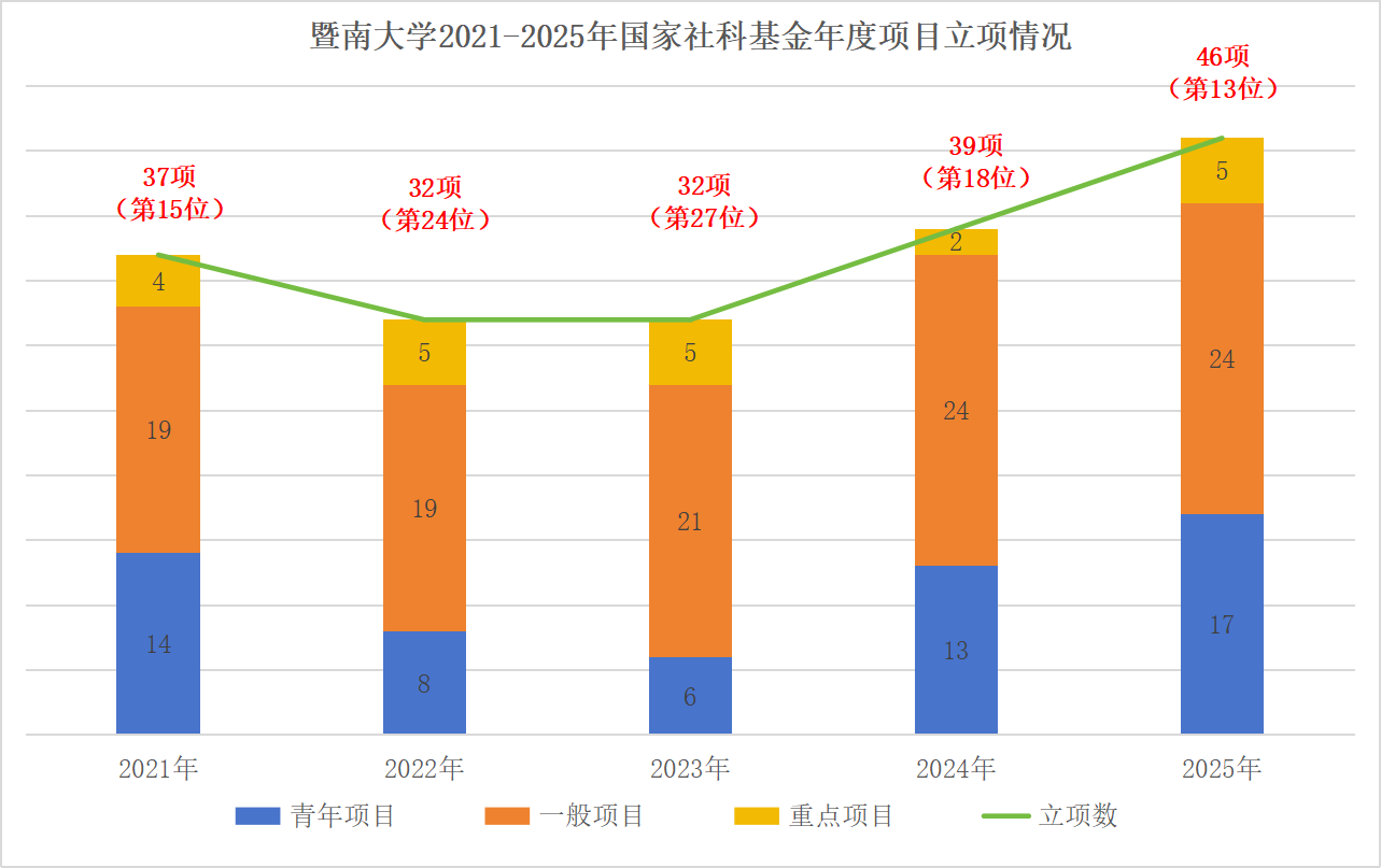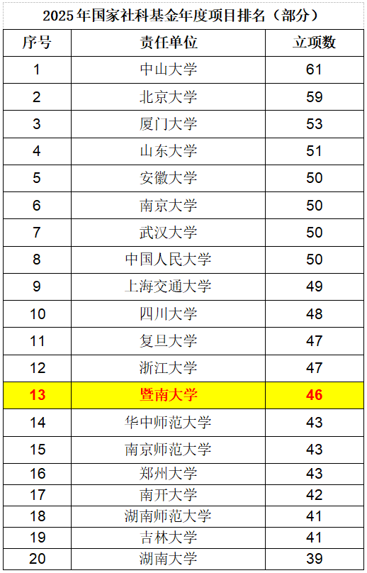 暨南大学融媒体中心讯 9月29日,全国哲学社会科学工作办公室公布2025年国家社会科学基金年度项目立项名单,暨南大学获批46项,项目获批量创历史新高,立项数位列全国第13位,较去年提高了5位,居“双一流”建设高校前列。