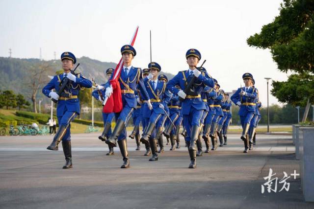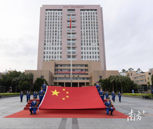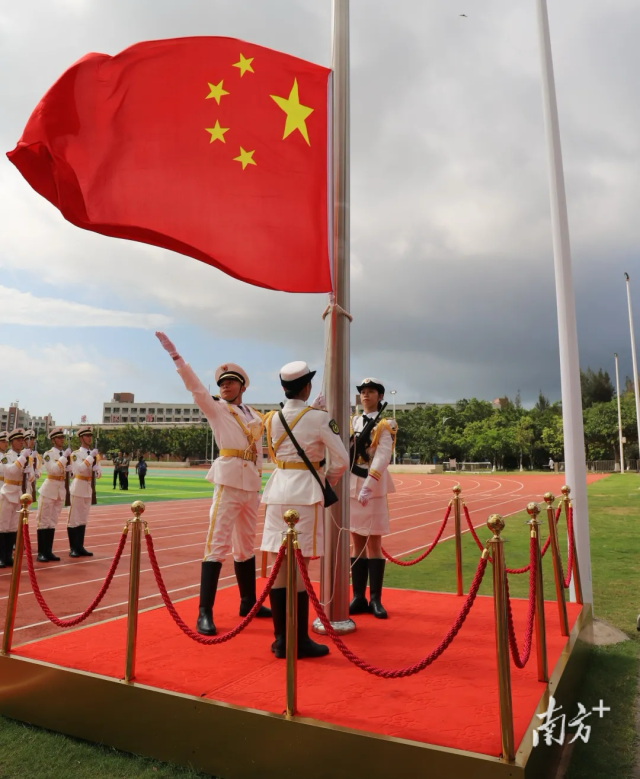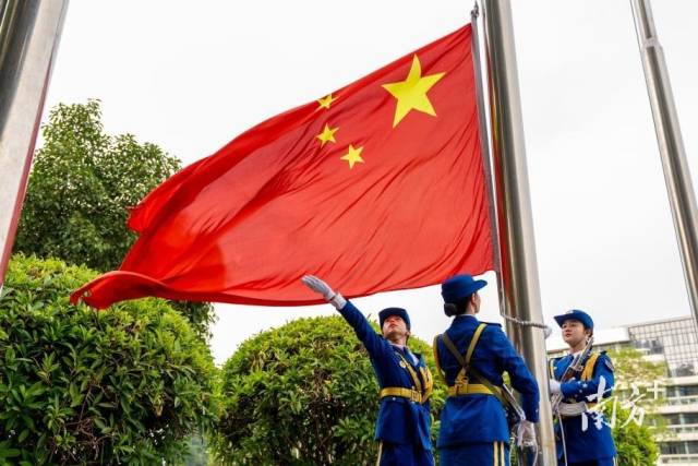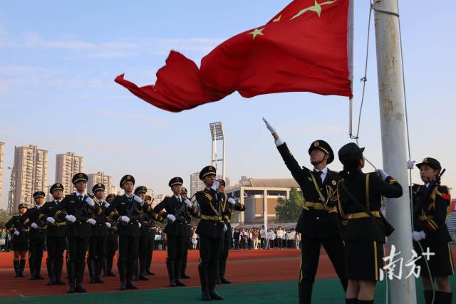 在广东高校里,一群年轻的身影迎着朝阳而立。他们步履铿锵、目光坚定,以昂扬之姿将五星红旗护送至旗杆之下,在晨曦中升起一抹庄严的红色。