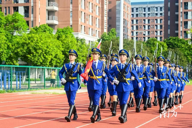 此外,国旗护卫队还积极投身大型活动志愿服务、校园秩序维护与应急事件处置等工作,持续营造爱国爱校的浓厚氛围,已成为学校一张亮丽名片。成立以来,队伍在省级展示中屡获佳绩,共获广东省学校国旗护卫队交流展示活动二等奖1项、三等奖4项。