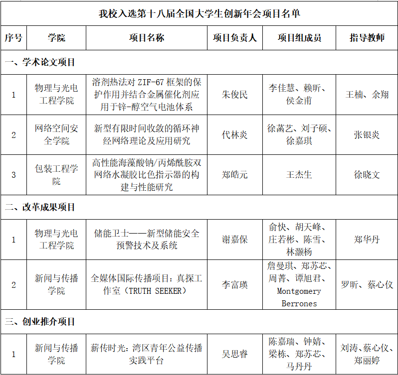 在本届全国大学生创新年会上,我校师生表现优异。物理与光电工程学院谢嘉保团队的“储能卫士——新型储能安全预警技术及系统”(指导教师:郑华丹)同时获得“最佳创意项目”奖及“我最喜爱的项目”奖;新闻与传播学院李富瑛团队的“全媒体国际传播项目:真探工作室(TRUTH SEEKER)”(指导教师:罗昕、蔡心仪)获得“我最喜爱的项目”奖。