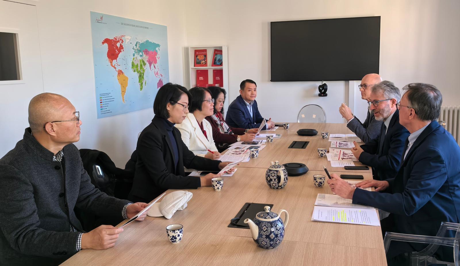在法国访问期间,代表团访问了法语联盟基金会,与法语联盟基金会秘书长Marc CERDAN、巴黎法语联盟校长Franck DESROCHES、法语联盟基金会亚洲区域代表Jean-François HANS等进行了会谈,双方回顾了开展法语教育合作以来取得的一系列成果,并就推动在法语师资培训、区域国别研究人才培养、研究生法语能力项目等方面的合作达成了共识,为学校“多学科+法语”的人才培养模式提供重要支持。我校于2018年与法语联盟基金会签署了《关于建立广州法语联盟的合作协议书》,合作开展法语教育,2024年8月广州法语联盟成为教育部备案的中外合作办学单位。此访是我校校领导首次访问法语联盟基金会。