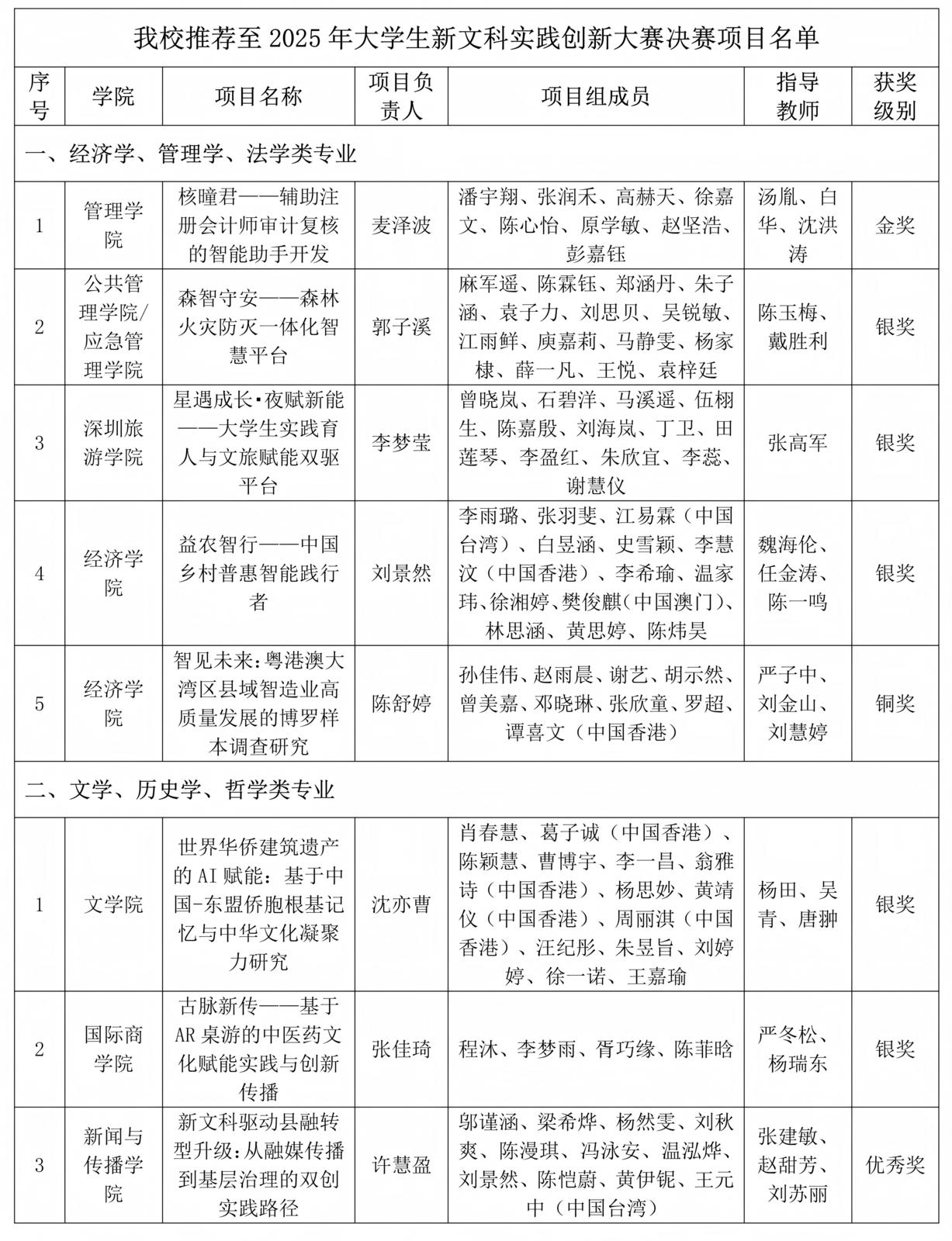 在决赛现场,管理学院麦泽波团队的“核曈君——辅助注册会计师审计复核的智能助手开发”获得金奖,公共管理学院/应急管理学院郭子溪团队的“森智守安——森林火灾防灭一体化智慧平台”、深圳旅游学院李梦莹团队的“星遇成长・夜赋新能——大学生实践育人与文旅赋能双驱平台”、经济学院刘景然团队的“益农智行——中国乡村普惠智能践行者”、文学院沈亦曹团队的“世界华侨建筑遗产的AI赋能:基于中国-东盟侨胞根基记忆与中华文化凝聚力研究”和国际商学院张佳琦团队的“古脉新传——基于AR桌游的中医药文化赋能实践与创新传播”获得银奖,汤胤、白华、沈洪涛3位老师获评优秀指导教师。