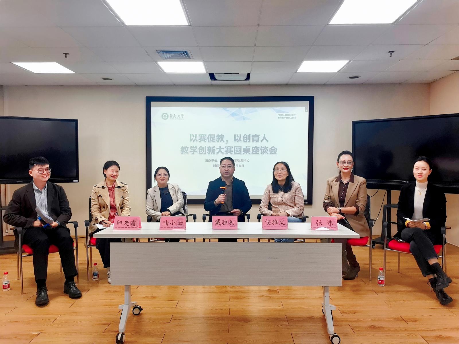 暨南大学融媒体中心讯 为充分发挥教学创新大赛的示范引领作用,加强对第六届广东省赛的宣讲动员,12月11日下午,由本科生院教师发展中心组织的“创新大赛辐射系列”教师教学创新工作坊——“以赛促教,以创育人:教学创新大赛圆桌座谈会”在曾宪梓科学馆601举办。活动采用“线上+线下”混合形式,100余名教师积极参与,现场交流氛围热烈。