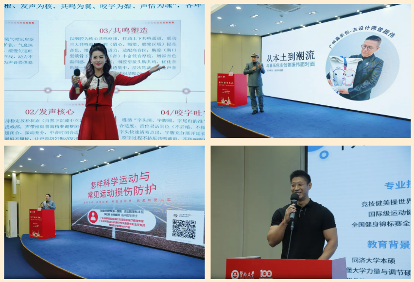 活动邀请了四位在各自领域取得卓越成绩的专家做专题分享。全国青联委员、广东省政协委员,著名歌唱家陈筱棠副教授以《声润美育:第十五届全国运动会〈天海一心〉赏析与声乐启蒙》为题,结合全运主题曲,带来一场融音乐艺术与心理健康的声乐讲座。国际当代艺术家、暨南大学艺术学院曾振伟教授分享《从本土到潮流——与喜乐包主创曾振伟面对面》,讲述如何在艺术创作中融合传统与当代元素来展示中华民族的文化自信,激励大家为弘扬祖国文化多做贡献。苏炳添运动医学保健专家、暨南大学附属第一医院运动医学科李劼若主任讲解了《科学运动与常见运动损伤的防护》,从专业角度普及健康运动、运动损伤修复的科学知识。竞技健美操世界冠军、国际级健将、暨南大学体育学院蒋帅老师带来《日常保持身材的妙招》,分享实用健身理念与科学饮食方法。
