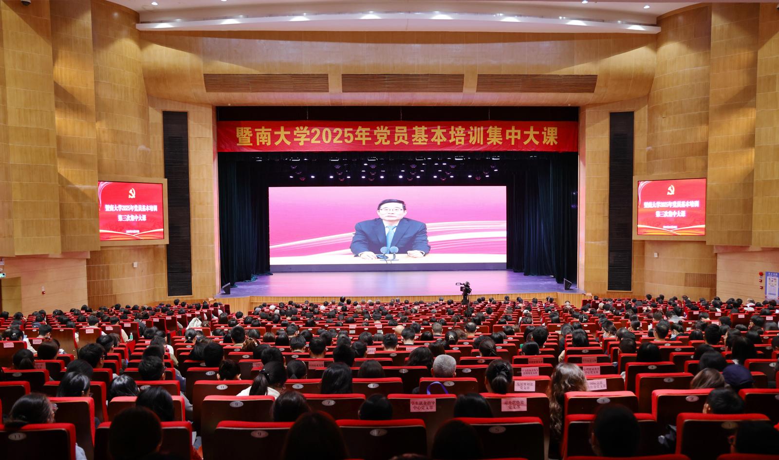 暨南大学融媒体中心讯 12月18日下午,暨南大学举办2025年党员基本培训第三次集中大课,学习中央党校(国家行政学院)副校长(副院长)李毅主讲的《深入学习贯彻习近平文化思想》视频课程。全校近万名师生党员在石牌校区礼堂主会场和三地五校区及附属医院82个分会场参加学习。