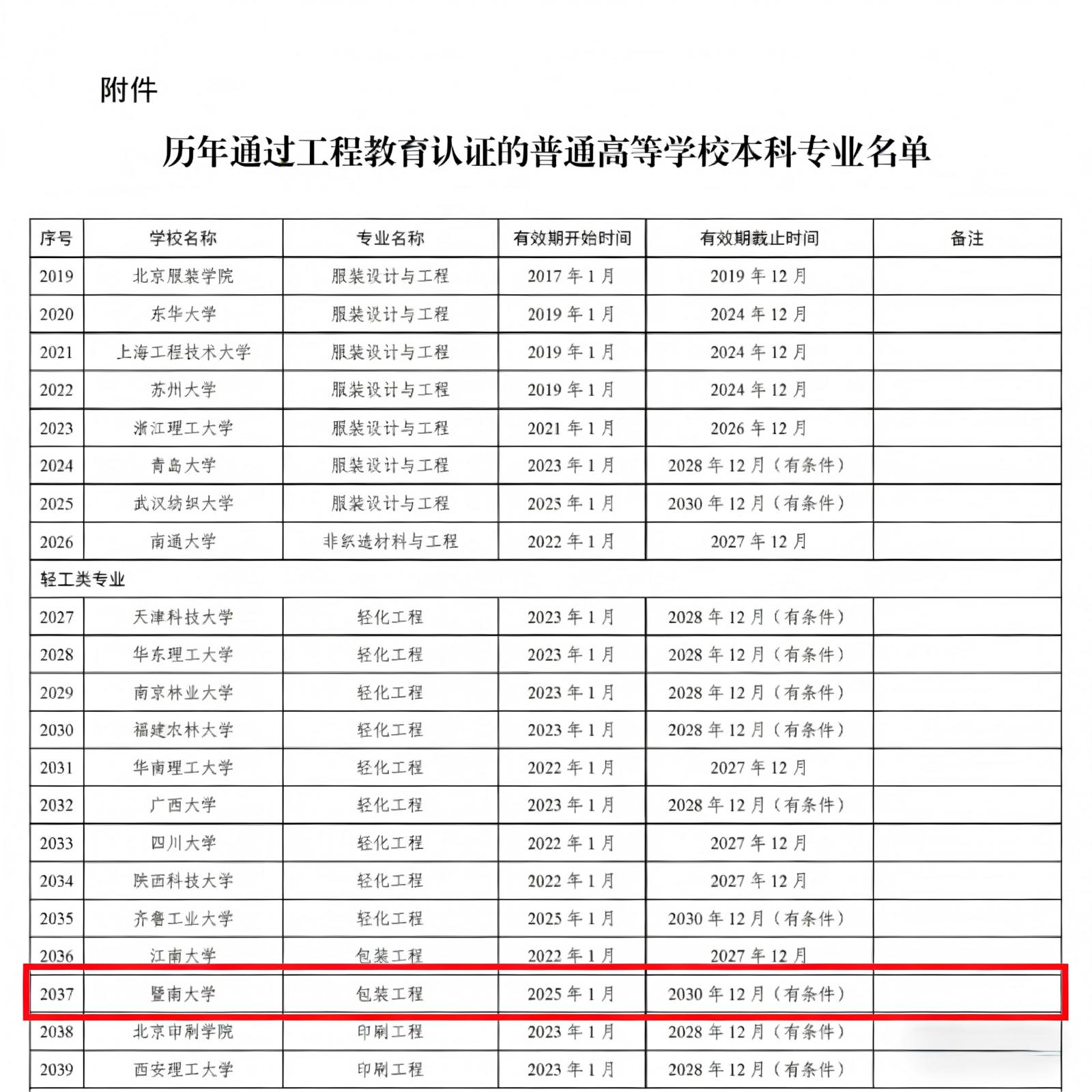 暨南大学融媒体中心讯 近日,中国工程教育专业认证协会、教育部教育质量评估中心联合发布通告,正式公布历年通过工程教育认证的普通高等学校本科专业名单,我校包装工程专业成功通过认证,有效期为6年。这标志着包装工程专业人才培养质量获得国际实质等效的工程教育标准认可,是包装工程学院推进新工科建设和专业高质量发展的重要里程碑。