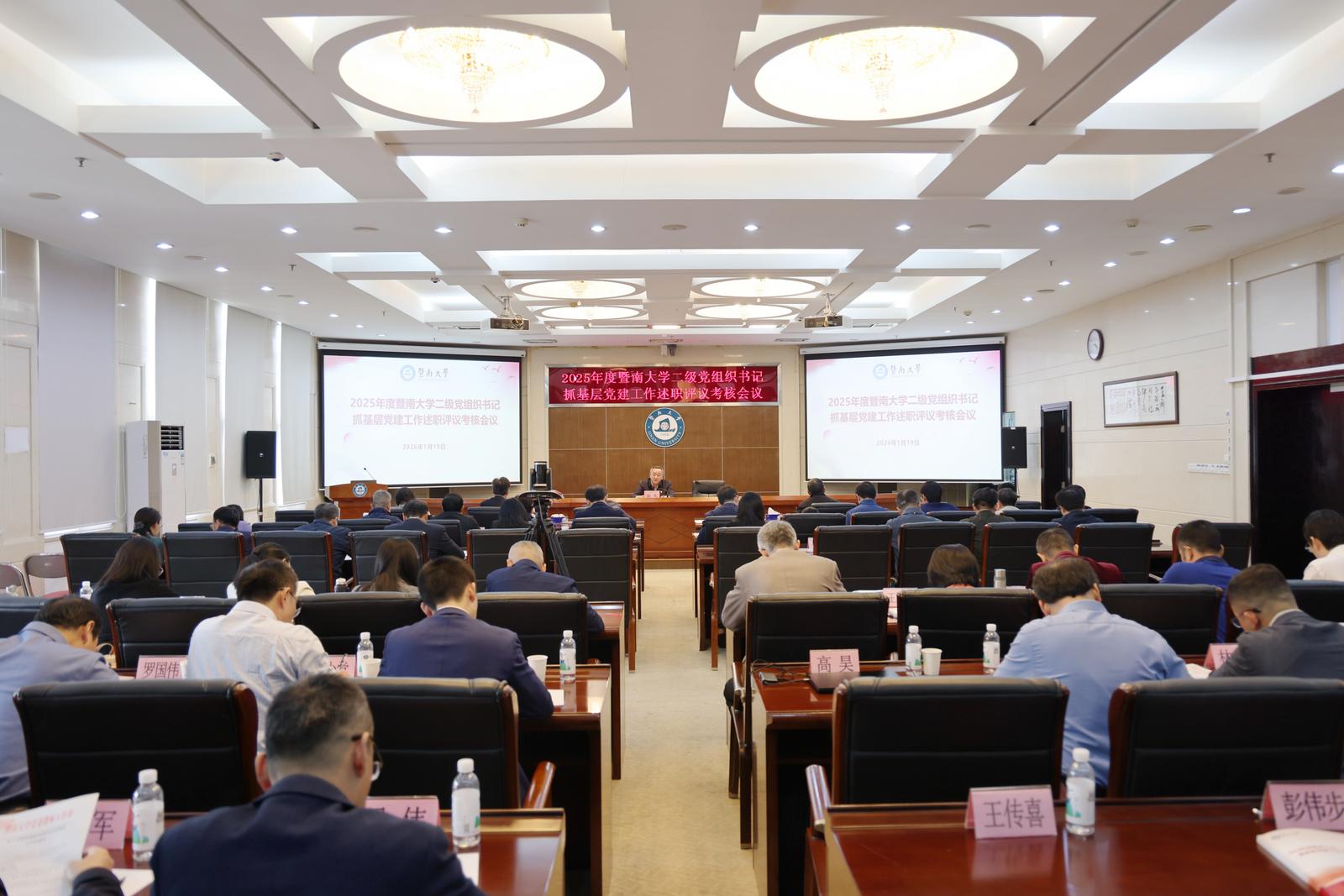 暨南大学融媒体中心讯 1月19日,学校2025年度二级党组织书记抓基层党建工作述职评议考核会议在石牌校区行政办公楼1111会议室召开。学校党员校领导、党群职能部门负责同志、基层党员师生代表和各二级党组织书记等70余人参加会议。会议由校党委书记孙彧主持。
