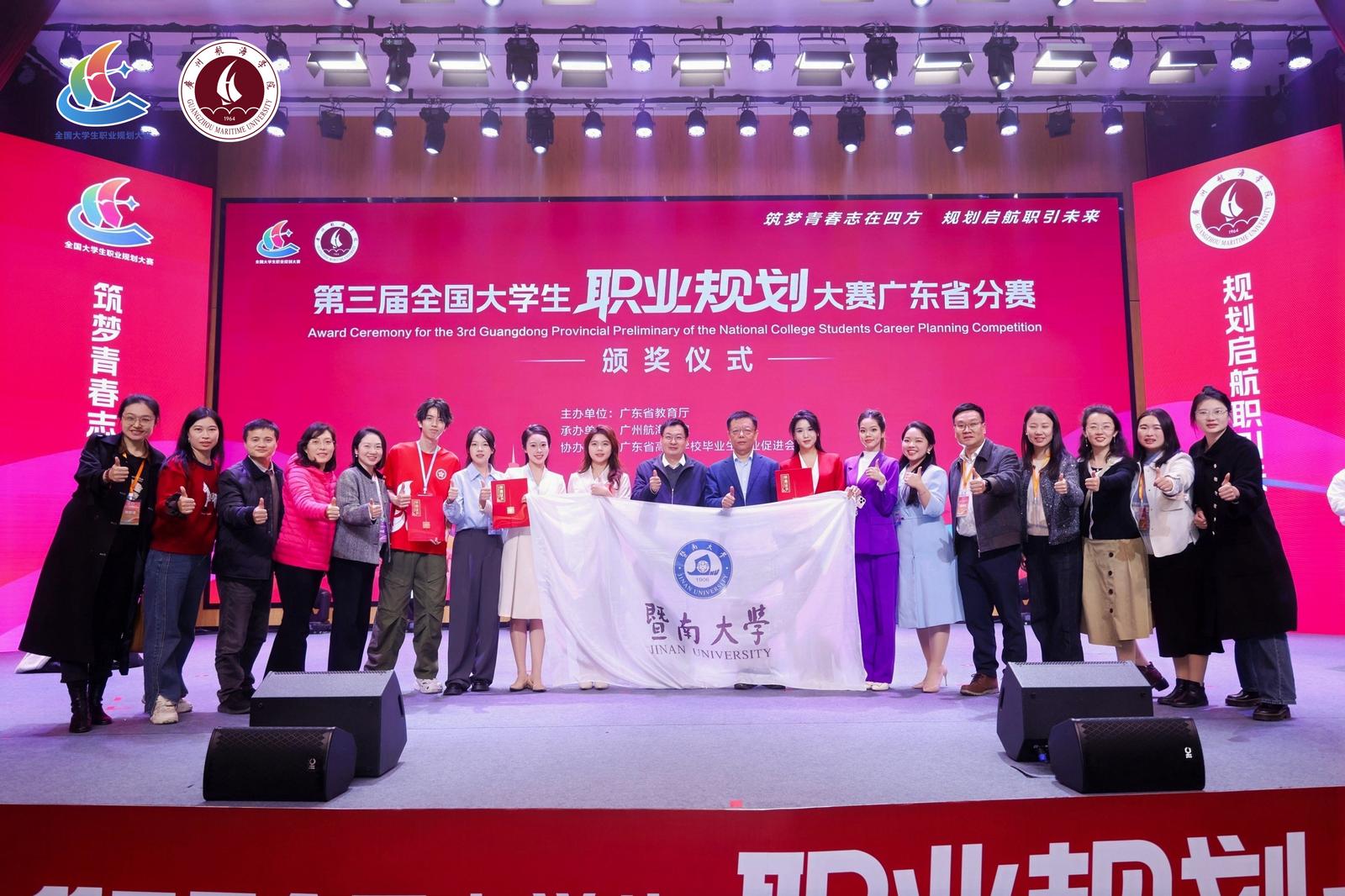 暨南大学融媒体中心讯 1月31日,第三届全国大学生职业规划大赛广东省分赛决赛在广州航海学院黄埔校区举行。我校8名选手满额入围成长赛道高教组、就业赛道高教本科生组和就业赛道高教研究生组三大赛道省决赛,获4金4银的优异成绩,各赛道均斩获金奖,金奖数量并列全省第一。