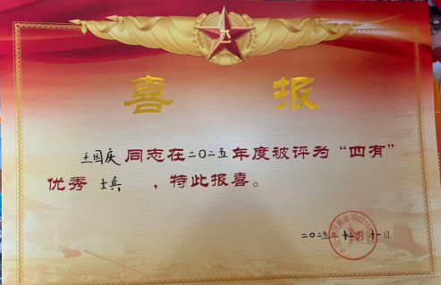 同时,2024年秋季参军入伍的国际商学院2021级市场营销专业学生王国庆,携笔从戎奔赴军营后,始终以高标准严格要求自己,在训练场上刻苦磨砺,在各项任务中奋勇争先,凭借过硬的综合素质和突出表现,获评2025年度“四有”优秀士兵。