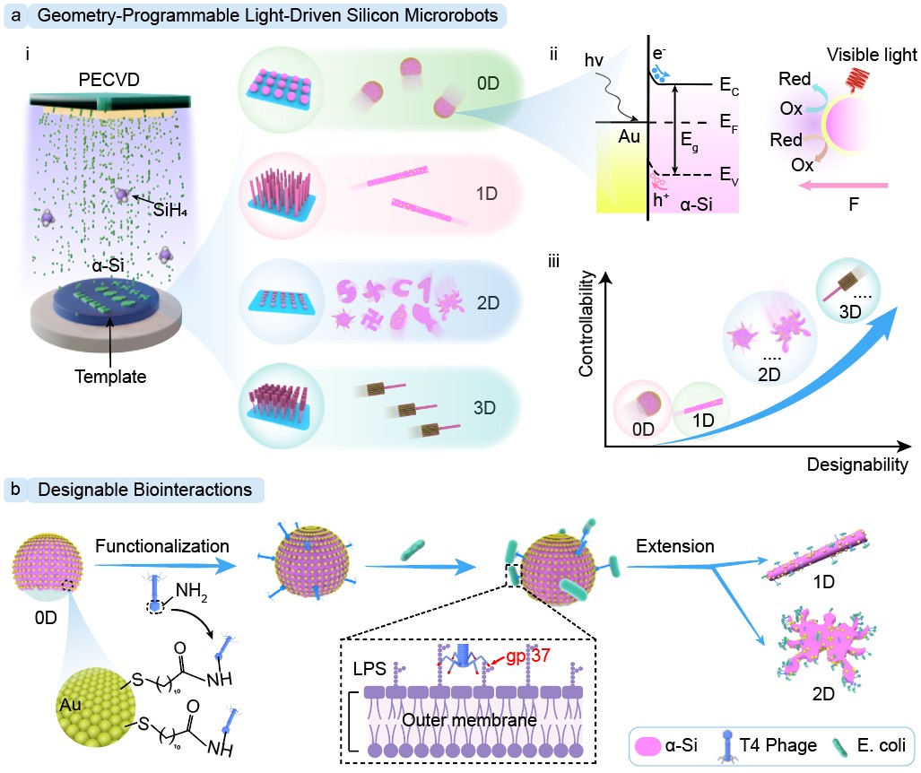 针对上述问题,研究团队提出了一种基于等离子体增强化学气相沉积(PECVD)的通用可扩展制备策略,成功构筑出可编程结构的多维硅基微机器人,显著拓展了其设计空间。在可见光及近红外激发下,该类硅基微机器人可实现高效自主推进,并通过引入磁性结构进一步提升了控制精度。此外,通过在微机器人表面功能化修饰噬菌体,使其具备对目标细菌的特异性捕获能力。该研究实现了硅基微纳机器人的结构可编程、多模态驱动与表面功能化的集成,为光驱动微纳机器人在精准医疗、环境监测及微纳制造等领域的应用提供了新的技术途径。