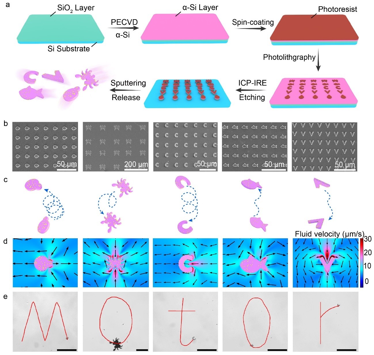 结合光刻技术可实现可定制化的二维模板结构制备,再通过PECVD沉积硅壳层,研究人员成功构筑出多种二维结构的微机器人。在可见光照射下,该类微机器人可实现高效驱动,并可通过光照的开关实现运动启停控制,运动速度亦可随光强实现精准调节。同时,借助结构设计引入几何不对称性,可对其运动行为进行调控,使其呈现定向行进、旋转等多种运动模式。进一步引入磁性结构后,在外磁场作用下微机器人可实现预设轨迹的精确操控,例如可书写出“Motor”字样轨迹。